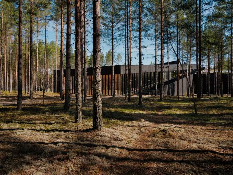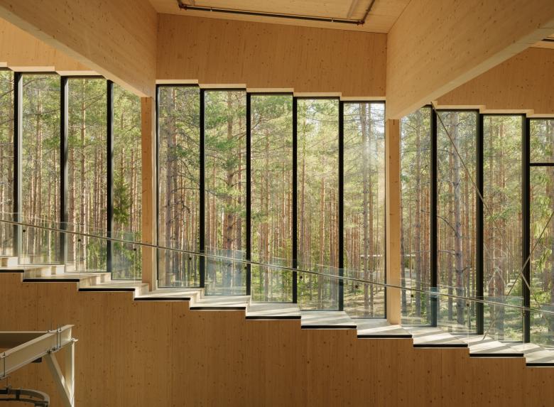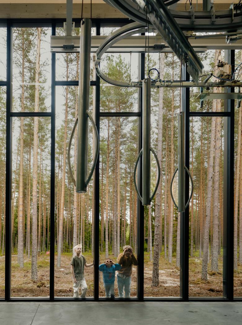Inside the factories, each wing has one alternating ceiling corner lifted to create inclined roofs that allow views into the production halls as well as the forest outside. Along the color and wood factory, the sloping roofs are extended to form a pathway for visitors and staff to hike up and down the building while observing the production processes inside. All four production units are built with 21 meter free-spanning, cross-laminated timber, creating flexible column free-spaces.
