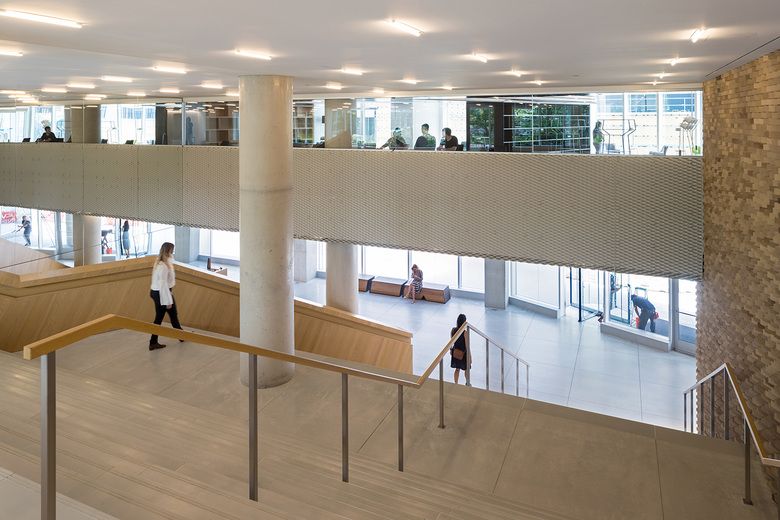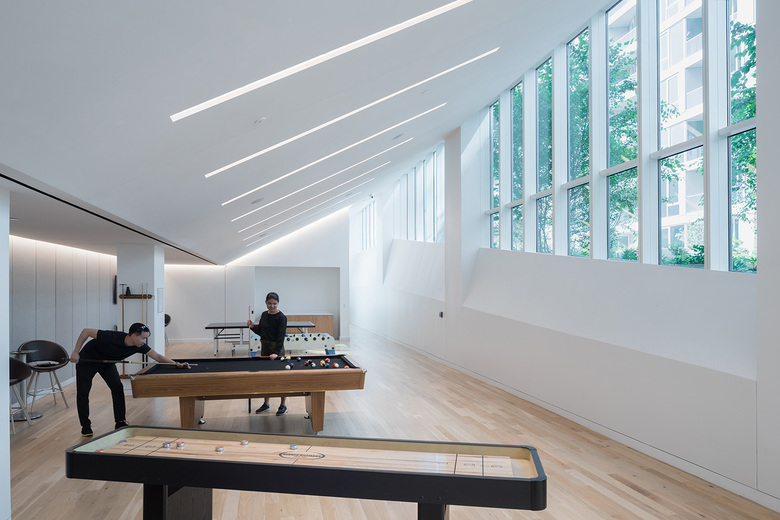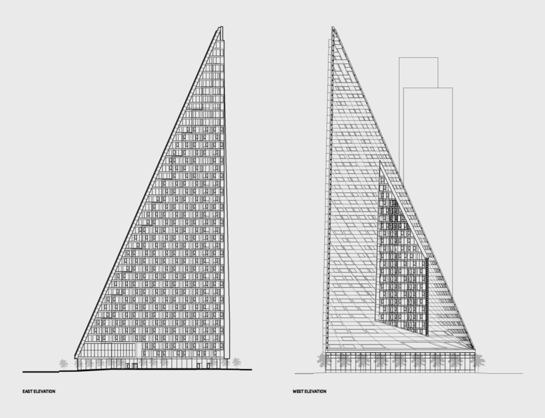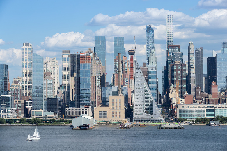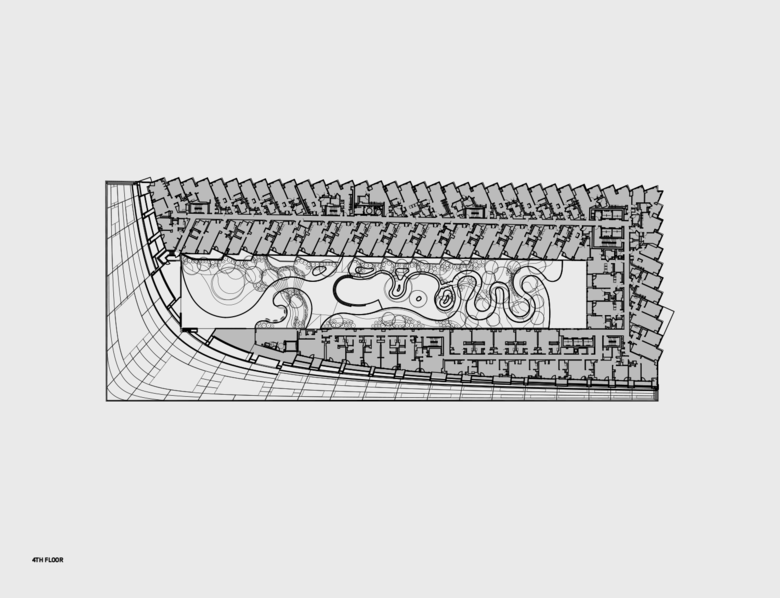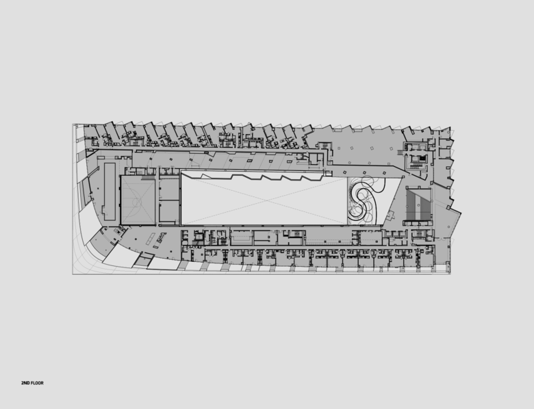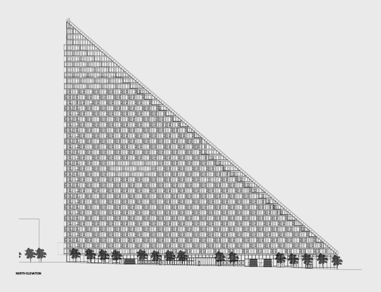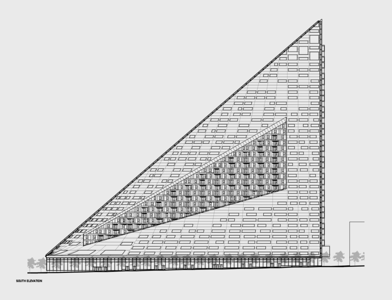 VIA 57 West is a hybrid between the European perimeter block and a traditional Manhattan high-rise, combining the advantages of both: the compactness and efficiency of a courtyard building with the airiness and the expansive views of a skyscraper. By keeping three corners of the block low and lifting the north-east corner up towards its 450 ft peak, the courtyard opens views towards the Hudson River, bringing low western sun deep into the block and graciously preserving the adjacent Helena Tower's views of the river. The form of the building shifts depending on the viewer's vantage point. While appearing like a pyramid from the West-Side-Highway, it turns into a dramatic glass spire from West 58th Street. The courtyard which is inspired by the classic Copenhagen urban oasis can be seen from the street and serves to extend the adjacent greenery of the Hudson River Park into VIA. The slope of the building allows for a transition in scale between the low-rise structures to the south and the high-rise residential towers to the north and west of the site. The highly visible sloping roof consists of a simple ruled surface perforated by terraces - each one unique and south-facing. The fishbone pattern of the walls are also reflected in its elevations. Every apartment gets a bay window to amplify the benefits of the generous view and balconies which encourage interaction between residents and passers-by.