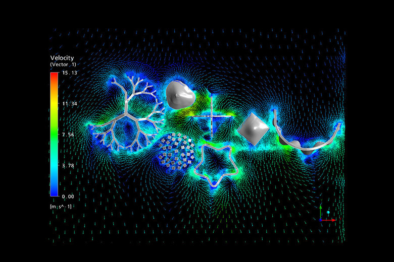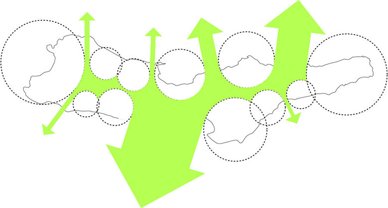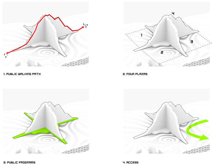 The landscaping of the island is derived from wind simulations of the microclimates created by the mountains. Swirly patterns created by the wind moving its way through the Seven Peaks inform the planting of trees and the placement of public spaces and plazas. Where the winds and turbulence are strongest the trees becomes denser, creating lower wind speeds and thus a comfortable outdoor leisure climate.