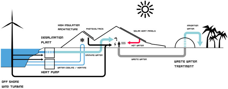 The buildings of the island are entirely heated and cooled by heat pumps connecting to the surrounding Caspian Sea. Solar heat panels integrated in the architecture create a steady supply of hot water, while photovoltaics on strategically located facades and roof tops power daytime functions as swimming pools and aqua parks.