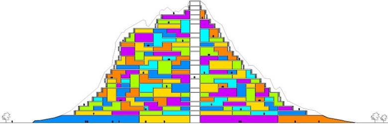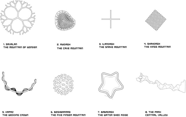 Each of the Seven Peaks house a resort development derived from the geometry of a famous mountain in Azerbaijan. Individually each mountain becomes a principle for mixing private and public functions. Together the mountains form an organic skyline merging with the natural topography of the island. A dense vibrant urban community connected to a series of private resort villages by a central public valley with golf courses and beaches. A continuous public trekking path connects the mountains and invites visitors to scale the top of all seven peaks.