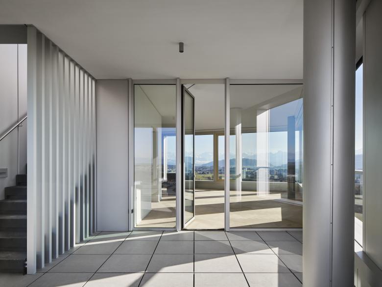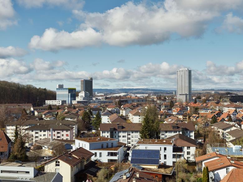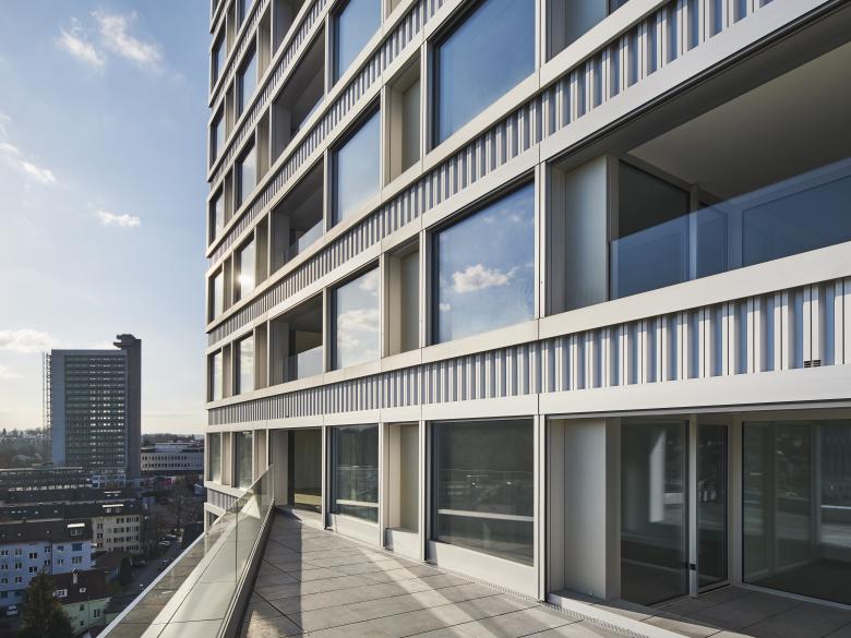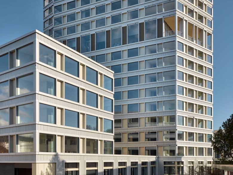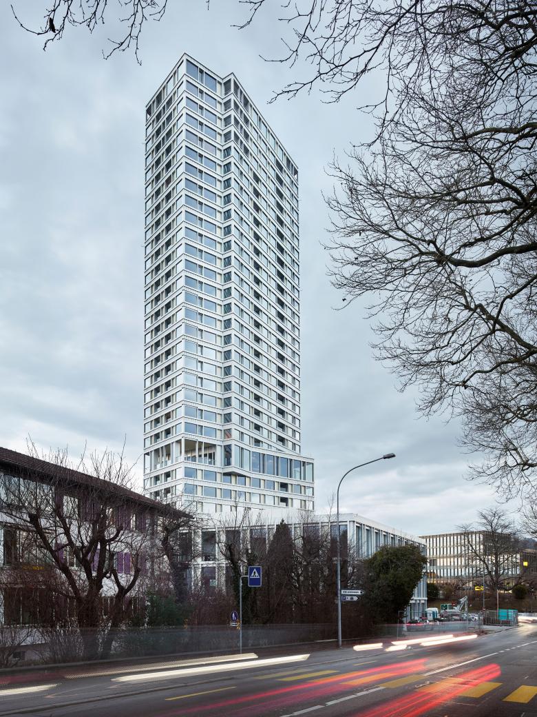 Das Zentrum Bären, in unmittelbarer Nähe zum Bahnhof Ostermundigen, bezweckt eine räumlich qualitätsvolle Verdichtung der Baustruktur verbunden mit der Schaffung von Mehrwert auf der Ebene des öffentlichen Raums. Das Hochhaus fügt einen neuen Massstab in das bestehende Siedlungsgefüge ein und setzt ein markantes, städtebauliches Zeichen. Der Turm ist rechtwinklig zur Bahnlinie und damit auch auf einen vorgelagerten Platz an der Bernstrasse ausgerichtet. Der rückwärtig ausgeweitete Gebäudesockel sowie der neue platzbildende Baukörper an der Bernstrasse vermitteln in Massstab und Geometrie zur angrenzenden Bebauung und deren Entwicklung. Massive Brüstungsbänder gliedern eine einheitliche Hülle über Turm, Schaft und Sockelbau. Zusammen mit der untergeordneten Vertikalstruktur verleihen sie der Hochhausskulptur eine vornehme Behäbigkeit und einen ablesbaren Massstab. Verglasungen unterschiedlicher Ausprägung und Funktion sind Ausdruck der Nutzung. Sie ergänzen das Spiel mit der Tiefe und lassen die Hülle zu einem Relief werden. Die Farbigkeit des Turms wird durch die gewählten Materialien bestimmt. Profile in Aluminium verleihen dem Turm zusammen mit dem auftretenden Reflexions- und Glanzgrad der Glaspartien eine zurückhaltende Eleganz.
