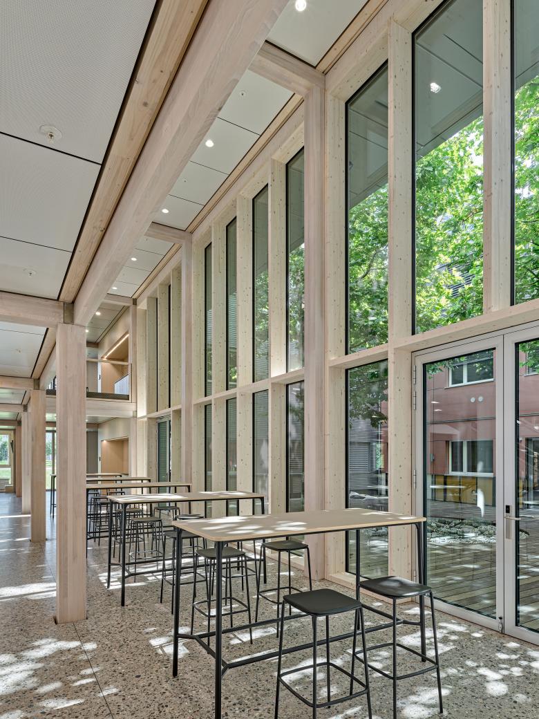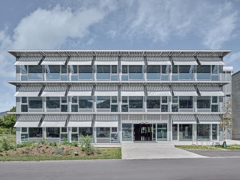 Das fein gegliederte Dachtragwerk mit Shedoberlichtern führt zusammen mit dem Sichtbezug in den Gartenhof Tageslicht in das Innere des Baus. In die Tragstruktur aus Stabbuche werden hybride Holzbetondeckenelemente eingefügt, welche sowohl der Kühlung, Heizung und Lüftung als auch der Raumakustik dienen. Die Treppenkerne in Stampflehm wie auch der aus Recycling-Boden im Erdgeschoss zeugen vom Anspruch, kreislauffähige und ökologische Materialien einzusetzen. Stellvertretend für aktuelle Strategien im Umgang mit einer CO2-reduzierten Bauweise folgt der Neubau dem Design for Disassembly-Gedanken – auch in der äusseren Erscheinung. So wird die filigrane Fassadenstruktur in Aluminium und Glas zweiseitig durch horizontal angeordnete Photovoltaik-Elementen komplettiert, welche dem Gebäude zusammen mit den Ausstellmarkisen eine beinahe spielerische Leichtigkeit verleihen. Durch die integral entwickelte Baustruktur entstand ein in Erstellung und Betrieb vorbildhafter Bau, der das Potenzial einer industriell geprägten Planungs- und Fertigungslogik in ein stimmiges Raumerlebnis überführt. Das in enger Zusammenarbeit von Bauherrschaft und Planern realisierte Gebäude wird unsere weitere Recherche zum Thema prägen.