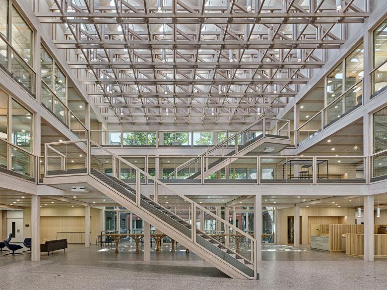 Das stark wachsende Unternehmen Erne AG Holzbau verdoppelte in nur zehn Jahren die Anzahl der Mitarbeitenden auf 330. Um aktuellem und künftigem Platzbedarf sowie zeitgemässen Organisationsformen gerecht zu werden, investierte das Holzbauunternehmen in einen Büroneubau am Standort Stein. Unter Einbezug des bestehenden Modulbaus entstand ein neues räumliches Ganzes mit Innenhof, in dem sich offene Raumsequenzen mit den Raummodulen des Bestandes zu einer flexiblen Bürowelt ergänzen. Dabei bildet die horizontale Erschliessungsfigur zusammen mit den zentral im Atrium liegenden Treppen und Verbindungsbrücken ein Kontinuum, welches die vertikale Verbindung zum im Erdgeschoss liegenden «Marktplatz» schafft.
