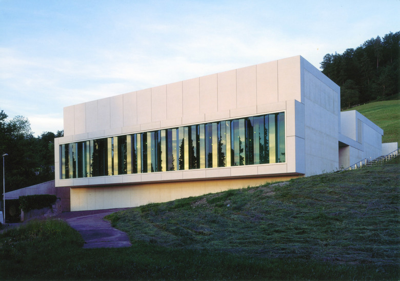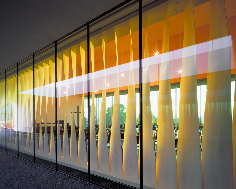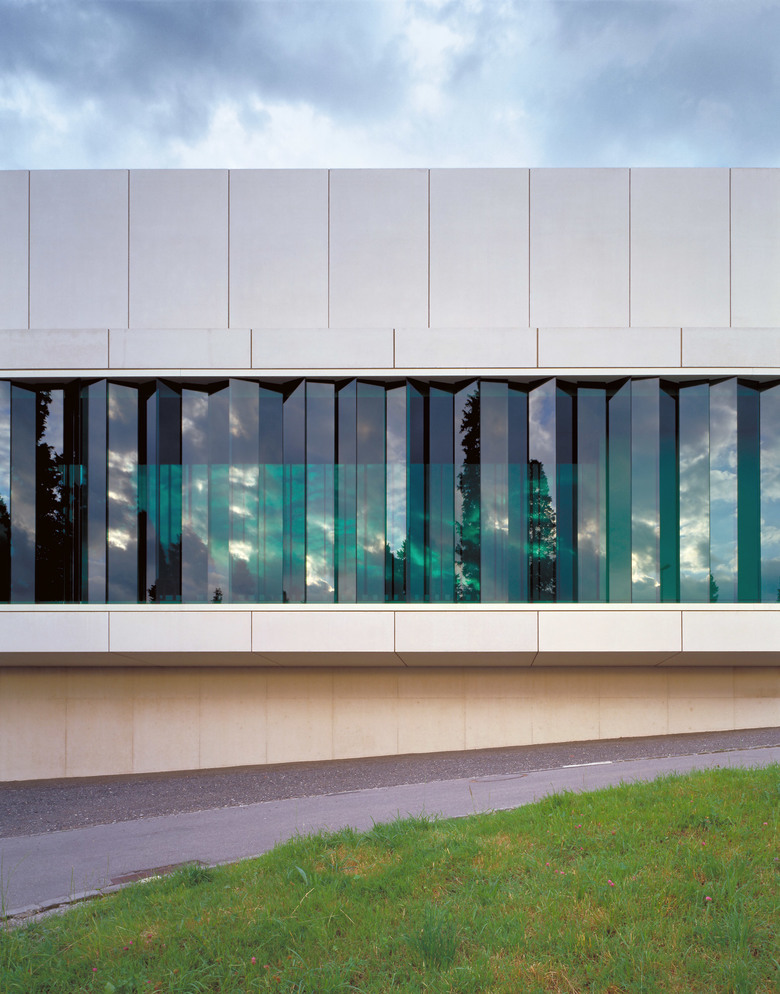 Unter einem gefalteten Dach vereint das Friedhofgebäude Räume unterschiedlichster Nutzung. Zwischen der parallel zum Hang angeordneten Abdankungshalle und den bergseitig teilweise ins Terrain eingegrabenen Aufbahrungs- und Diensträumen liegt ein sich über die gesamte Gebäudetiefe erstreckender Eingangshof. Diesem kommt eine besondere Bedeutung zu: Als von Wänden und Vorsprüngen begrenzter Aussenraum weitet er sich mit seiner Öffnung gegen den Himmel ins Unendliche. Als Passage verkörpert er den Übergang von der irdischen Welt ins Reich der Toten. In der Gebäudemittelachse liegend dient der gefasste Eingang zum Friedhof auch als Besammlungsort der Trauergemeinde bei Abdankungen. In der Querachse gelesen bildet er eine Art Fuge zwischen den Raumschichten, die von den Katafalken über den Innenhof bis zu den Glaslamellen der Talfassade reichen. Die mit verdrehten Holzlamellen nach einem Entwurf des Künstlers Hugo Suter angereicherte Glasschicht auf beiden Längsseiten des Innenhofes ist ebenso differenziert gestaltet wie die raumhaltige, grossformatige Öffnung des Abdankungsraumes zur Landschaft mit ihren frei stehenden, zueinander abgedrehten Glaslamellen. Insgesamt entsteht eine reichhaltige Sequenz unterschiedlich ausgestalteter Filter- und Schwellenräume.