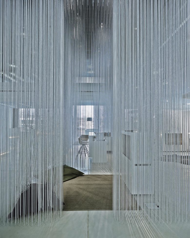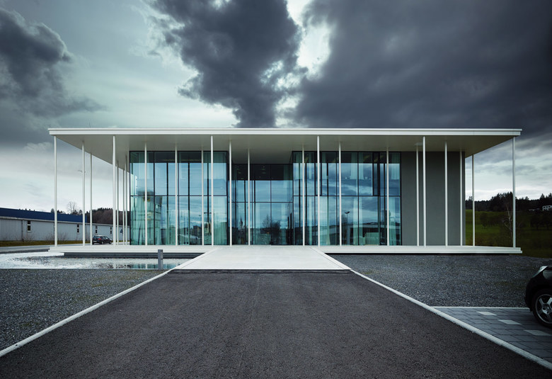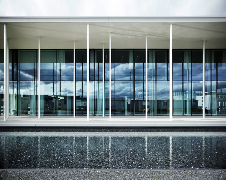 Am Ortsausgang von Hochdorf wird ein Ensemble von Fabrikations- und Bürogebäuden um einen Pavillonbau ergänzt, der durch seine prägnante Stellung an der Kantonsstrasse und seine architektonische Sprache die Werte der Marke talsee – eine auf hochwertige Badmöbel spezialisierte Firma – zum Ausdruck bringt. Ein markanter zweigeschossiger Portikus umgibt das Gebäude und spannt zwischen der Umgebung und dem Innenraum eine je nach Ausrichtung unterschiedlich tiefe Raumschicht auf. Diese durch frei angeordnete Stützen rhythmisierte Zone gewährleistet die nötige Distanz zwischen innen und aussen, sichert den verglasten Fassaden einen hohen Grad an Eigenverschattung und schafft maximale Transparenz für die dahinter liegenden Ausstellungsflächen. Der auf zwei Seiten vorgelagerte Reflecting Pool steigert die Nobilität des Gebäudes und lässt dieses schwebend erscheinen. Die Besucher gelangen über ein baumbesetztes Feld und eine leicht ansteigende Rampe, welche die Wasserfläche überspannt, zum Eingang. Das atmosphärische und räumliche Zentrum des Gebäudes ist die doppelgeschossige Halle, die durch ein raumhaltiges Spiel von Aluminiumketten akzentuiert wird. Ringförmig um die Halle sind im Erdgeschoss der Showroom und im Obergeschoss Büros angeordnet. Die Ausstellungsflächen verfügen dank der überhohen Halle über unterschiedliche Raumhöhen, wodurch sie sich auf vielfältige Weise bespielen lassen.