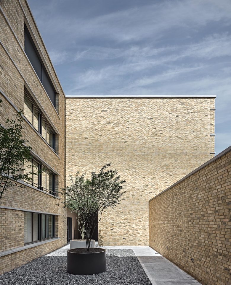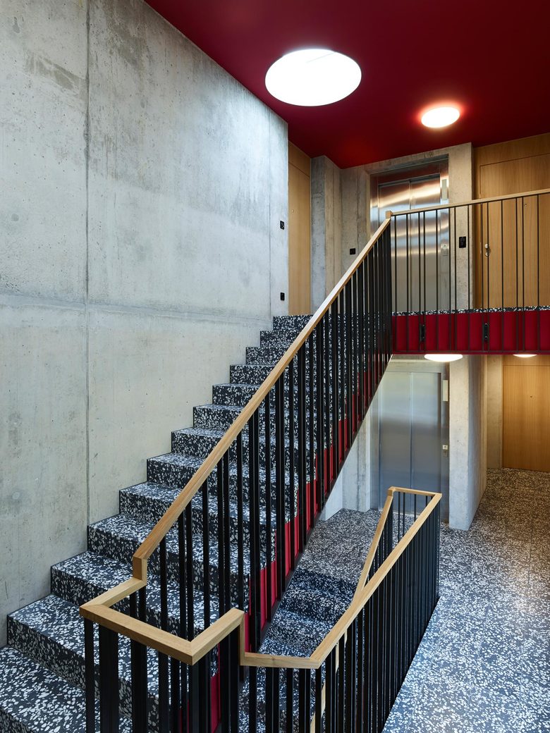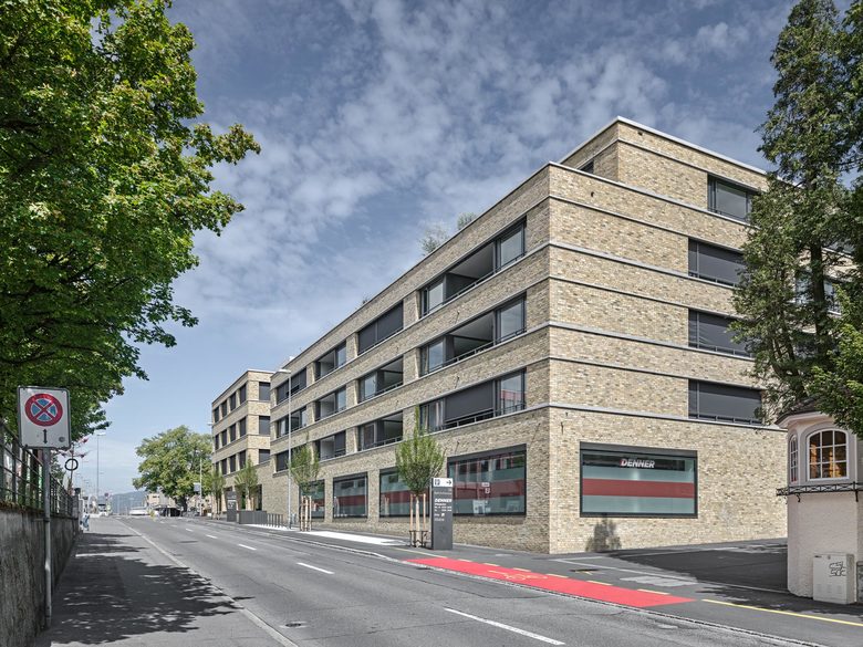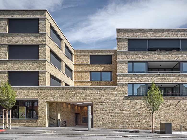 Das Wohn- und Geschäftshaus schliesst den Bahnhofplatz Richtung Osten ab und bildet zugleich den Auftakt zur Bahnhofstrasse. Dieser städtebaulich markanten Lage wird durch die volumetrische und funktionale Gliederung Rechnung getragen, basierend auf dem baurechtlich zugelassenen Spielraum: Einschnitte entlang der Bahnhofstrasse und der Bahnlinie erzeugen über dem durchgehenden Sockelgeschoss ein mäanderförmiges Volumen. Während die Büronutzung zum Platz orientiert ist, befinden sich die Wohnungen entlang der Strasse mit Blick zum östlich gelegenen Parkgrundstück. Die durchgängige Dachkote sowie die Materialisierung in hochwertigem Sichtmauerwerk verbindet die differenzierte Gebäudeform zu einem Ganzen und verleiht dem Neubau die gewünschte einheitliche Erscheinung.