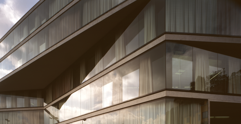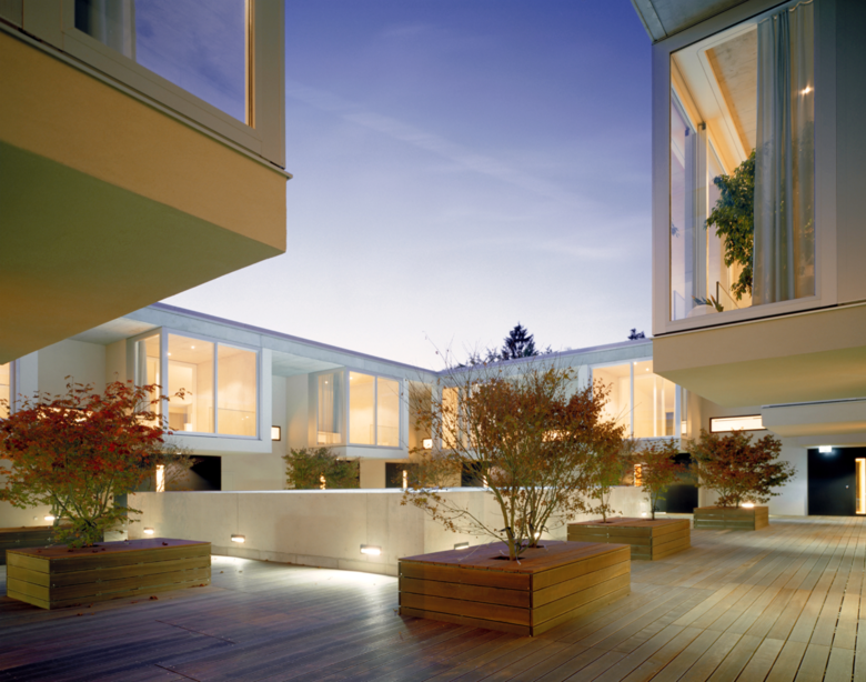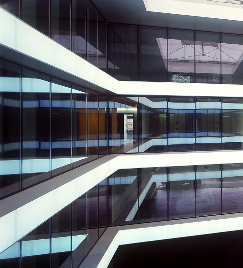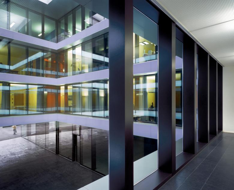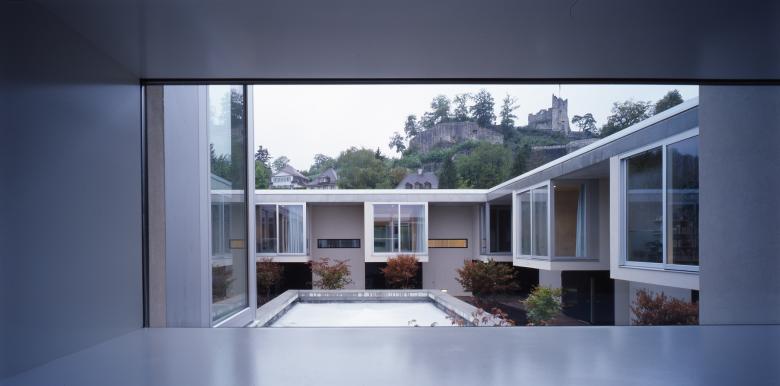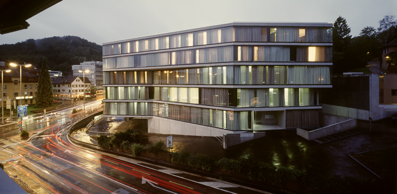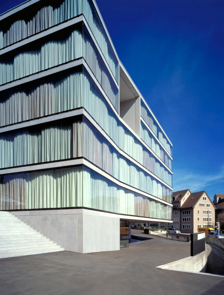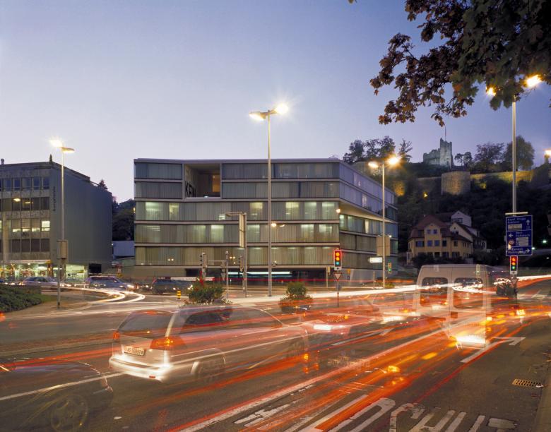 Durch seinen selbstbewussten Auftritt und die ambivalente Erscheinung vermag das Wohn- und Geschäftshaus Falken an seinem in vielerlei Hinsicht neuralgischen Standort zu klären und zu vermitteln. Einerseits ist der Schulhausplatz ein stark frequentierter Verkehrsknotenpunkt, andererseits treffen an dieser Stelle unterhalb der Burgruine Stein und westlich der Altstadt verschiedene Stadtmorphologien aufeinander. Der Baukörper reagiert mit einem präzis geschnittenen Volumen auf die Gegebenheiten des Ortes, schafft über seine Brechungen einen Bezug zur Umgebung und setzt am südlichen Eingang der Stadt einen städtebaulichen Akzent. Eine auf Glas und Beton reduzierte Membran umspannt das Volumen flächenbündig und erzeugt ein Erscheinungsbild, das über seine Tonalität und Reflexion neue Wahrnehmungsmöglichkeiten bietet. Leicht gewellte, geschosshohe Textilien in der raumhaltigen Zwischenschicht dienen als Sonnenschutz und verleihen dem Körper zusätzliche Tiefe. Durch den Wechsel von Verschleierung und Enthüllung entsteht ein geheimnisvolles Spiel und ein sich ständig änderndes Äusseres. Die Polychromie der Vorhänge schafft eine Referenz zu den Steinen und den Farben der Stadt.