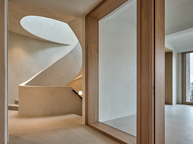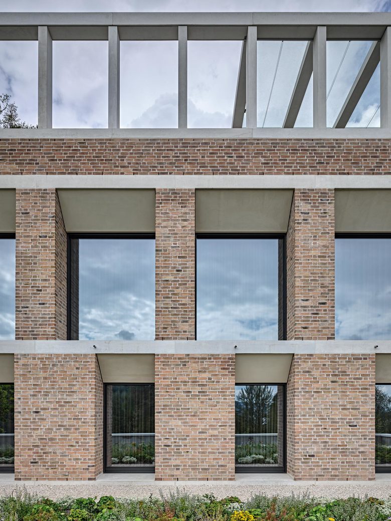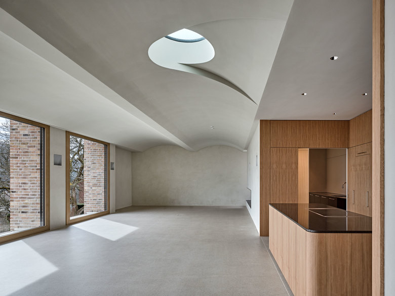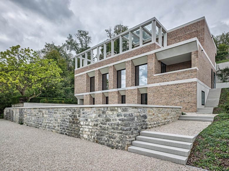 In einem durch Villenbauten und grosszügige terrassierte Gartenanlagen geprägten Gebiet fügt sich der Neubau des privaten Wohnhauses sowohl mit seiner ortsbaulichen Setzung als auch mit seiner Farbigkeit in die bestehende Quartierstruktur ein. Die Lage an der oberen Hangkante führt zu einer Schnittdisposition, bei der die Gebäudeerschliessung über das oberste Geschoss erfolgt und die Räume in der Abwärtsbewegung durch das skulptural ausgeprägte Treppenhaus an Privatheit gewinnen. Der Garten fliesst in Terrassenstufen offen und grosszügig weiter hangabwärts. Durch die tiefen Fensterlaibungen und die Auflösung der Krone wirkt das dreigeschossige Volumen talseitig trotz der Massivität des Backsteins leicht. Die Aussenwandkonstruktion besteht im Wesentlichen aus einem wärmedämmenden Einstein-Ziegelmauerwerk mit vorgemauerter Sichtbacksteinschale. Die Atmosphäre der Innenräume zeichnet sich durch die Kombination von eingefärbten Kalkputzwänden, geschliffenen Anhydritböden und Schreinerarbeiten in Kastanienholz aus und verkörpert eine, dem Bautypus verpflichtete zurückhaltende Eleganz.