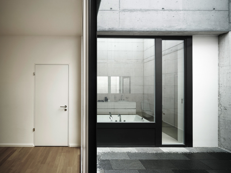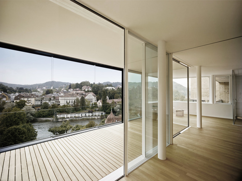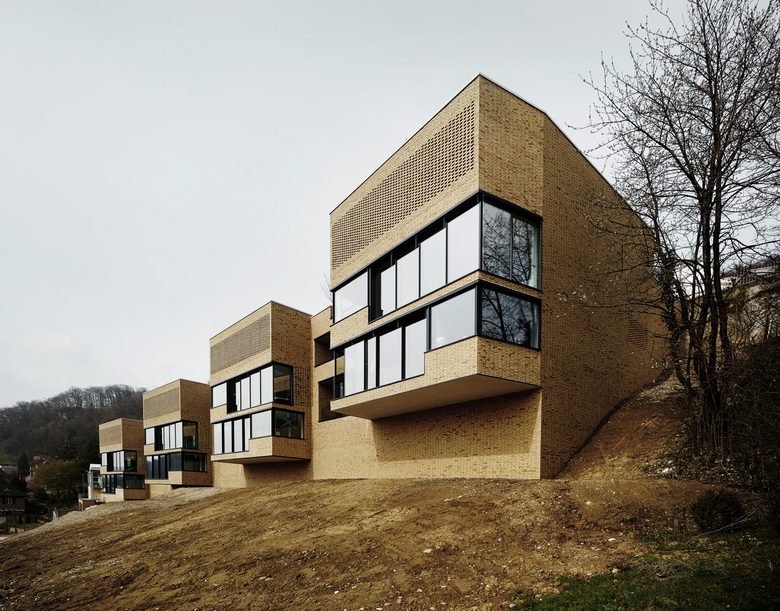 In Ennetbaden, hoch über dem Limmatknie, liegt die Wohnüberbauung Goldwand mit Blick auf das gegenüberliegende Bäderquartier. Der Baukörper mit acht Eigentumswohnungen schliesst eine Lücke in der mehrheitlich mit Einfamilienhäusern bebauten Umgebung. Durch die Staffelung in der Höhe und die leichte Verdrehung der vier Segmente zueinander fügt sich das Volumen mühelos in die Körnung des Quartiers ein. Die Lage am stark abfallenden Hang führt zu einer speziellen Raumorganisation: Auf Strassenniveau befinden sich die Parkierung und der Zugang zur Vertikalerschliessung, auf den zwei darunterliegenden Ebenen sind je zwei Wohnungen pro Segment angeordnet. Jeder Wohnung ist ein Vierjahreszeitenzimmer vorgelagert. Die oberen Einheiten verfügen rückseitig zudem über einen intimen Innenhof, dem ein weiteres Zimmer zugeordnet ist. Die horizontal gegliederte Fassade besteht aus grossformatigen Öffnungen und Mauerwerksflächen unterschiedlicher Art, wodurch sich die räumliche Struktur abzeichnet. Der eigens angefertigte beigefarbene Ziegelstein wird zur Erzeugung geschlossener Mauern ebenso wie als lichtdurchlässiger Sichtschutz verwendet.