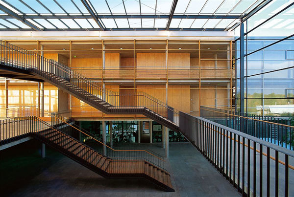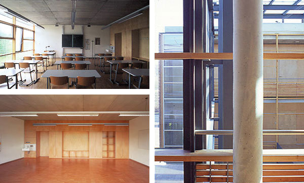 Das Innere des Gebäudes wird um eine Halle organisiert, die Eingangshof und Pausenhof bewußt und sichtbar verknüpft und die Topographie des Ortes auch im Inneren erlebbar macht. Die gläserne Halle, die als Verbindung und Naht auf der einen Seite, als Pausen-| Aufenthaltsbereich und Aula auf der anderen Seite dient, ist wichtiges, prägendes Entwurfselement; hier findet der "Schulalltag und Austausch" statt. Die Schule ist klar gegliedert in ihre verschiedenen Bereiche die zu Einheiten zusammengefaßt sind. Vielfältige Räume für Entwicklungsmöglichkeiten anzubieten, Distanz und Nähe zuzulassen, war Ziel; jede Klasse jeder Fachbereich finden ihre eigene Identität.