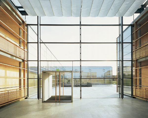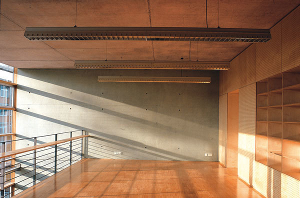 Thema war möglichst ein leistungsfähiges modernes Konzept mit hohen Energie - Einsparungsmaßnahmen in allen Bereichen für die Zukunft zu finden, um die Unterhaltskosten zu reduzieren. Die gezielte Anordnung der kompakten Gebäude um eine Halle, ermöglicht effektive passive Solarenergienutzung. Der Gebäudetyp mit massivem Sichtbeton - Wand | Deckenelementen unterstützt den Gedanken. Zur elektrischen Energieeinsparung wurde eine tageslichtabhängige Lichtsteuerung über Sensoren realisiert. Eine extensive Dachbegrünung verbessert das Klima und entlastet die Kanäle.