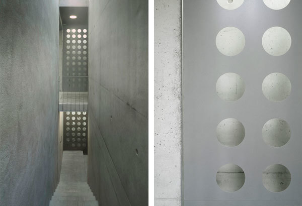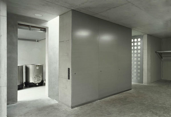Die neuen betrieblichen Räume wurden entsprechend den funktionalen Anforderungen, auf Ihre minimalen Elemente Wand, Decke und Boden reduziert und in einer homogenen Stahlbetonoberfläche hergestellt. Alle technischen Einbauten, wie Leuchten, Rinnen und Schalter wurden frühzeitig in die Planung integriert. Die Installation der Tanks im UG zusammen mit der Gebäudetechnik und den Leuchten werden in einer abgehängten Konsole geführt und zu einem Gestaltelement zusammengefasst. Technisch hochinstallierte Bereiche wurden zu sogenannten Laboren zusammengefasst und je zentral für den betrieblichen Ablauf angeordnet. Eine flexible mehrteilige Schiebewand aus geschosshohen Stahltafeln, verschließt die Labore und fasst den Raum zu einer gestalterischen Einheit. Der neue Lastenaufzug mit Treppenanlage bildet zusammen mit einer Präsentationsnische den repräsentativen Eingang für die Kunden. Eine Präsentation der Auszeichnungen des Winzers als Installation macht neugierig und gibt Einblick in die Philosophie des Winzers.
