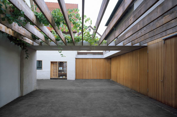 Es war uns wichtig den bereits 2001 umgebauten Verkauf in das Gesamtkonzept gestalterisch mit einzubinden. Die Materialwahl und Detailausbildung in Ihrer Reduktion und die wenigen gezielten Maßnahmen bilden die Grundlage dafür im Äußeren wie Inneren. Der Hofbereich wird durch den Anbau eines großzügigen Vordaches aus Stahlbeton neu eingefasst; und bildet gleichzeitig den Rahmen für eine hölzerne, großzügige Pergola, die als lichtes, weinberanktes Lamellendach Raum bietet zum Keltern und für die traditionellen Weinfeste. Alle heterogenen Wand-, Tor- und Türbereiche erhalten ein einheitliches Holzkleid und bilden die Kulisse des neuen Hofes.