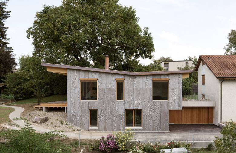 Das neue Stöckli an der Pantloostrasse in Dübendorf liegt in einem Einfamilienhausquartier in durchgrünter, zweiter Reihe und zeigt sich mit zwei unterschiedlichen Gesichtern: In Richtung Hermikonstrasse erweitert es repräsentativ das bestehende Einfamilienhaus zu einem harmonischen Ensemble, zum grossen Garten hin duckt sich das Stöckli als eingeschossiger Pavillonbau unter den grossen alten Nussbaum. Die gewählte Konstruktion, ein massiver Holzbau, steht stellvertretend für diesen spannungsvollen Spagat. Auch die eigenwillige Dachform sucht auf konzeptueller Ebene den Bezug zum Bestand und vermittelt trotzdem Eigenständigkeit. Zudem unterstützt sie die räumliche Öffnung des Hauptwohnraums zum Garten.