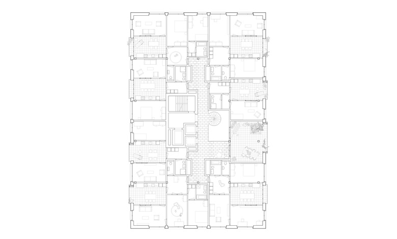 Jeweils drei Geschosse sind über eine Erschliessungshalle mit Wendeltreppe miteinander verbunden. Damit entstehen mehrere übereinandergestapelte, dreigeschossige Mehrfamilienhäuser mitten im Hochhaus. Das Prinzip der Wohnungen besteht darin, dass alle Zimmer inkl. Wohnzimmer und Küche annähernd die gleichen Dimensionen aufweisen. Alle Individualzimmer sind über Entrée, Diele oder Küche erschlossen und ermöglichen somit, dass das Wohnzimmer als zusätzliches Individualzimmer genutzt werden kann. Gleichwohl bleibt dank der grosszügigen Vierjahreszeiten-Loggiaküche ein angemessener Wohnungsmittelpunkt bestehen.