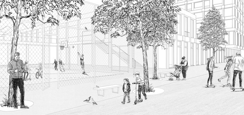 Das Augenmerk des Wettbewerbsbeitrags richtet sich einerseits auf die Auseinandersetzung mit einer Verbindung zwischen dem kleinteiligen Wohnquartier und der stark befahrenen Thurgauerstrasse, andererseits versucht es für die Schule eine angemessene «Mitte» zu schaffen. Erschwerende Aspekte für Letzteres sind die Raumknappheit auf dem südlichen Schulhausperimeter und der Höhenunterschied im Gelände. Das Projekt sieht daher vor, auf der einen Seite den Freiraum der Quartierstrasse und auf der anderen Seite die beruhigte Vorzone entlang der Thurgauerstrasse in den Schulhausperimeter zu integrieren. Um den Höhenunterschied zu überbrücken, werden die Gebäude als verbindendes Element agieren. Dadurch gelingt es, für die Schule einen intimen, halbprivaten Raum zu schaffen und ihr gleichzeitig sowohl gegen Osten als auch gegen Süden ein Gesicht zu geben.