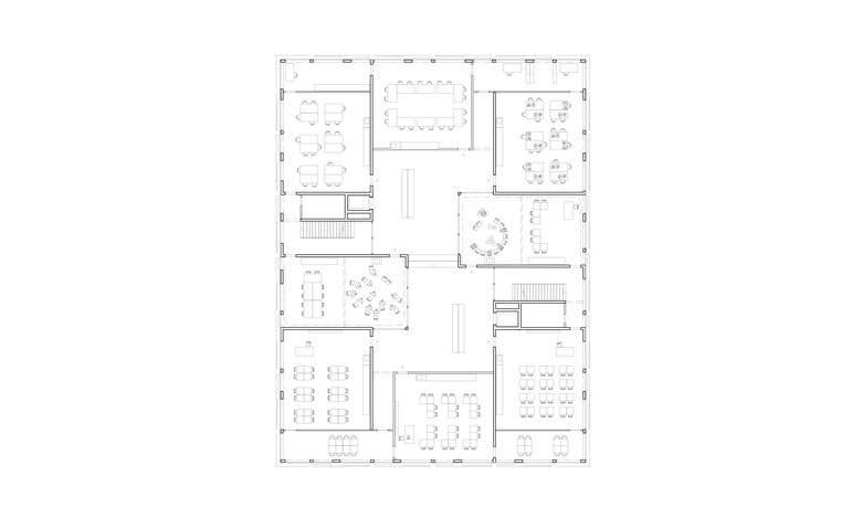 Die Gesamtschule ist als zusammenhängendes Volumen konzipiert. Das Eingangsgeschoss, der Pausenplatz und der Allwetterplatz – zentrale Orte der Schule – werden über grosszügige Treppen, welche geschickt in die Gebäude integriert sind, verbunden. Auf kurze interne Verkehrswege von Schüler:innen, Lehrer:innen und Betreuungspersonal, aber auch von Hausdienst wurde speziell geachtet. Alle Räume mit Arbeitsplätzen befinden sich im Erdgeschoss oder in den Obergeschossen und haben Bezug zum Tageslicht. Entlang der Turnhalle ist im Erdgeschoss die Galerie mit Blick in die Turnhalle hinunter angeordnet. Die Galerie als Rückgrat-Erschliessung verbindet durch die Schule hindurch den Allwetterplatz mit dem Park, dient als Erschliessung der Turnhalle im zweiten UG und beherbergt Werkräume, Musikzimmer und Büros vom Hausdienst. Die verglasten Fronten bringen der Nutzung entsprechend genügend Tageslicht von der natürlich belichteten Turnhalle in diese Räume und beleben zugleich die Galerie – es entsteht eine belebte «Werkgasse».
