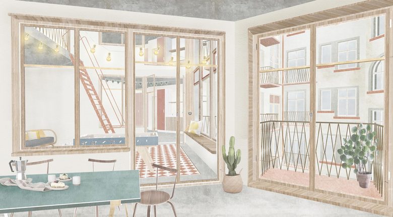Das fertig gebaute Wohnhaus für Studierende erhält in seiner Mitte einen lebendigen und gemeinschaftlichen Schwerpunkt. Die Wohnräume und Küchen der Wohngemeinschaften wachsen, den schmalen Hof überspannend, zu einer grossen gemeinschaftlichen Zone zusammen.