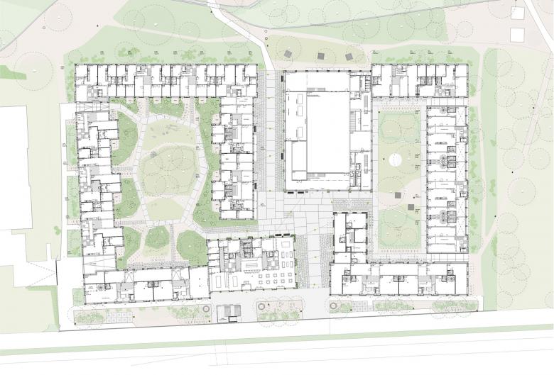 Dieser Knoten bildet das Herzstück des Projekts und verknüpft sich gleichzeitig mit den beiden Hofräumen zu einem zusammenhängenden und spannungsvollen Siedlungsaussenraum. Innerhalb der Siedlung gliedert sich der Aussenraum übergeordnet in drei räumlich und atmosphärisch unterschiedliche Bereiche: den wohnlichen Hofgarten, den urbanen Gassenknoten und den langgezogenen Atelierhof. Während im Hofgarten die Grünflächen bis an die Fassaden greifen und eine freie polygonale Formensprache dominiert, wird der Atelierhof streng orthogonal gestaltet. Auch die Wegführung wird differenziert ausgebildet und reagiert auf die geplanten Erdgeschossnutzungen. Im Atelierhof wird das Wechselspiel zwischen Innen und Aussen, Besucher:innen und Mieter:innen gesucht, die Erschliessung erfolgt ringförmig entlang der Fassade. Hingegen löst sich das Wegenetz im Hofgarten von der Fassade und schafft so mehr Privatsphäre vor den Wohnungen. Die öffentliche Nord/Süd-Durchquerung mäandriert durch den Gassenknoten und bildet so ein Wechselspiel zwischen Erschliessungs- und Aufenthaltsbereichen.