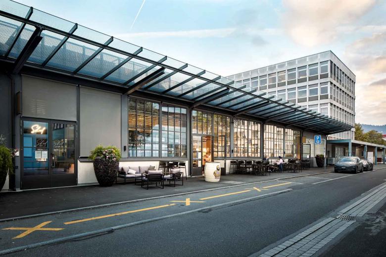 Die Halle, wenige Gehminuten vom Bahnhof Zug entfernt, empfängt Gäste von beiden Seiten mit ihren grossen Glasfronten willkommen.