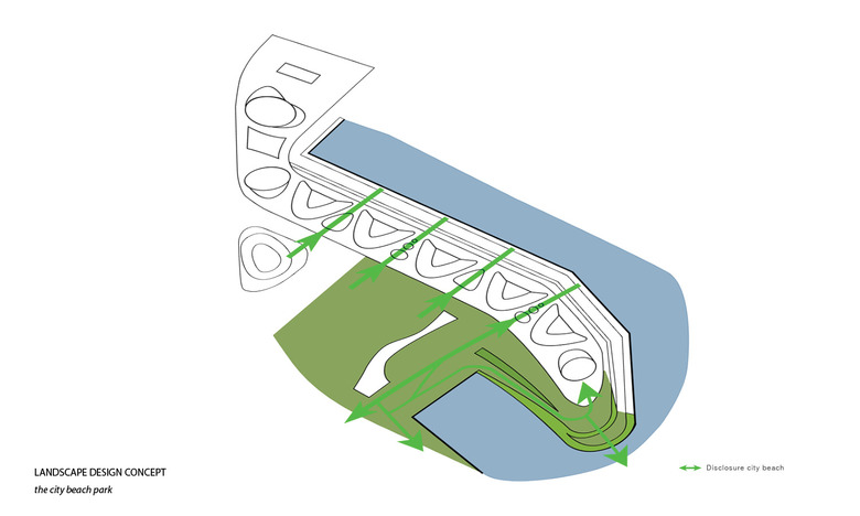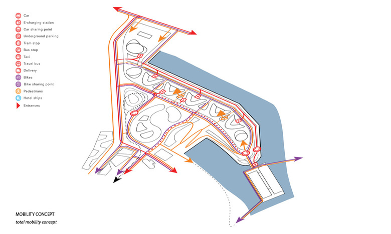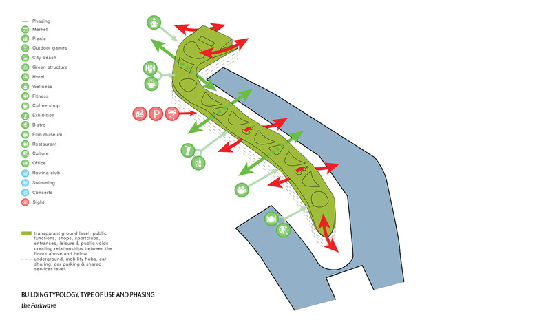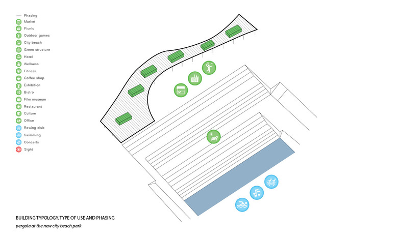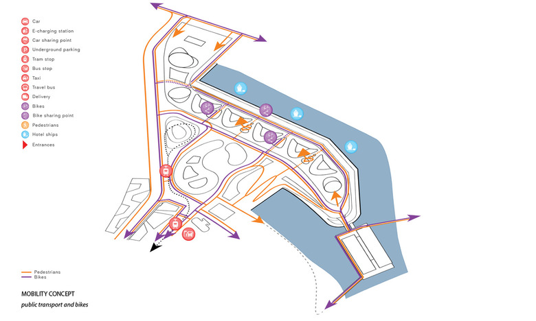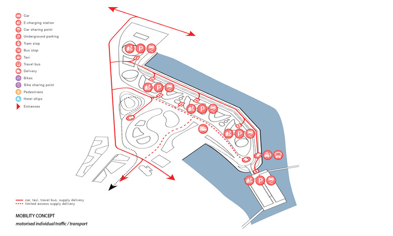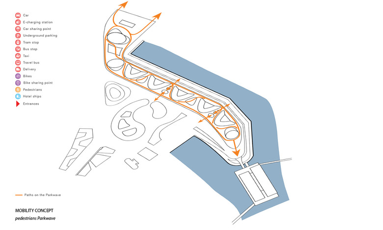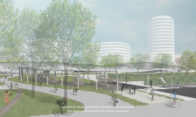 An innovative, adaptive and sustainable mobility concept is necessary to allow this landscape park, which significantly reduces road traffic in the foreseeable future. On the other hand, mobility for every individual, but also the whole society is important; meaning, a city's overall mobility strategy must be well connected, very attractive and versatile, that rethinking is easy and an added value becomes apparent. The mobility concept for the Holzhafen Park connects the parent system with a dense pedestrian and bicycle trail network on several levels which is on all sides connected with existing networks. Attractively designed car and bicycle sharingpoints are easy to find, and arranged centrally under the waved roof of the park. The embankment along the dock B is the main access for the motorized private transport, taxis, and suppliers designed as an attractive Promenade. Here motorists find the access to the mobility level for rental and sharing cars, as well as to the related underground car park, which extends in a north south direction along the Green promenade . Normally the Holzhafen Park is characterized by pedestrians and cyclists. Emergency access for support services is possible as well as in fixed time frames for delivery traffic. In this way, areas for motorized traffic in favor of green spaces can be limited. At the interface between Medien Hafen and Holzhafen Park, an new, urban, public space is created, where a transparent pergola acts as a filter to the Urban Beach. Here people find the ice or Curry sausage seller as well as the espresso bar and the fresh food seller.