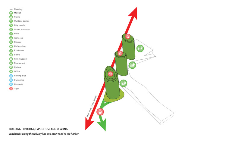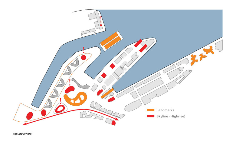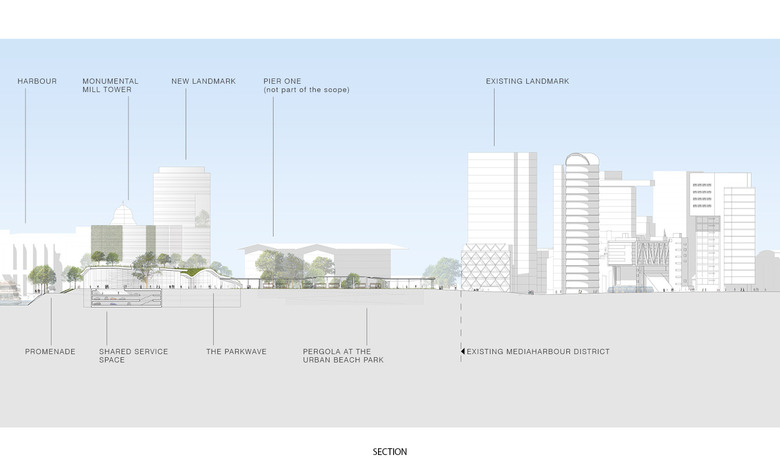 The three high-rise buildings along the railway line characterize the skyline of the Holzhafen Park in the south and blend the new urban configuration into the existing and overall picture of the towers in the Media Port. The high-rise and pergola in the south-east welcome at an attractive location the commuter daily leaving the tram or bus at this stop. The northern tip of the port peninsula is marked by a free-standing landmark. On the one hand the tower marks the location, on the other hand it fits its position and moderate hight in the overall picture and respects the importance of the tower of the former mill in the skyline. The contour of the building volumes under or above the Park Wave are been designed in a way that provides on both sides high-quality public spaces, that multiple visual relationships arise and the character of the park can flow through east-west direction.