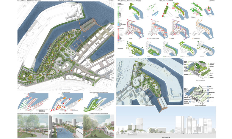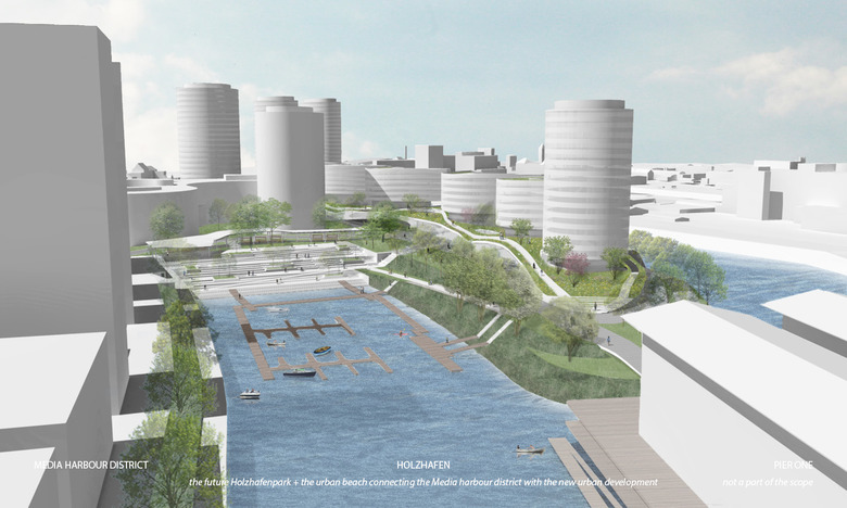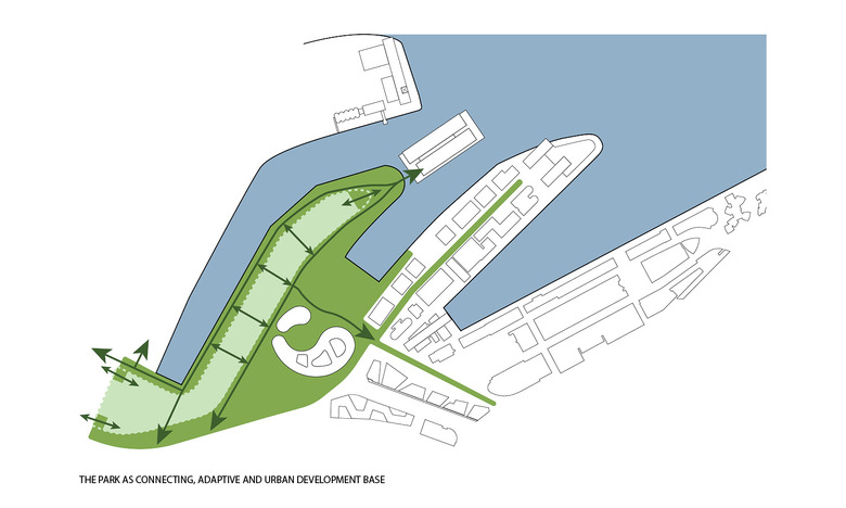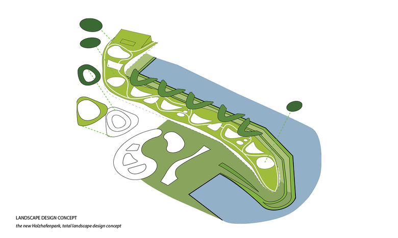 The urban planning concept of the peninsula Kesselstraße in its particular location between the media port and the industrial port will have both in city spatial and functional terms a unique function in the urban context. The urban development concept for the peninsula Kesselstraße must be designed facing a rapidly changing future and the green, compact and diverse city of tomorrow. A concept that is adaptable and creates attractive habitats for various uses, both during the day and in the evening in every season. To achieve this, it requires a strategy, not posed as in classical urban development first and foremost by the arrangement of building volume, but that creates a resilient, adaptive basis for the development of the area and networking in the context. At the same time a permanent identification hotspot for people and businesses must be created on the peninsula. A landscape park can achieve this. A landscape park as a site for new businesses, for people working in the enlarged media port, tourists, who arrive or stay there, as well as for local residents and water sports enthusiasts. A park as an attractive living environment where people work, meet friends and colleagues, do sports, listen to concerts, and visit exhibitions or spend the lunch break at the water. In this concept the peninsula of Kessel street is being developed as Holzhafen Park.