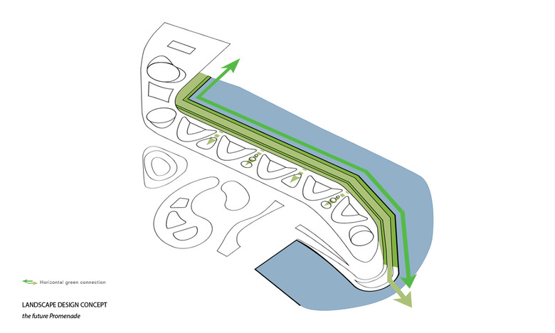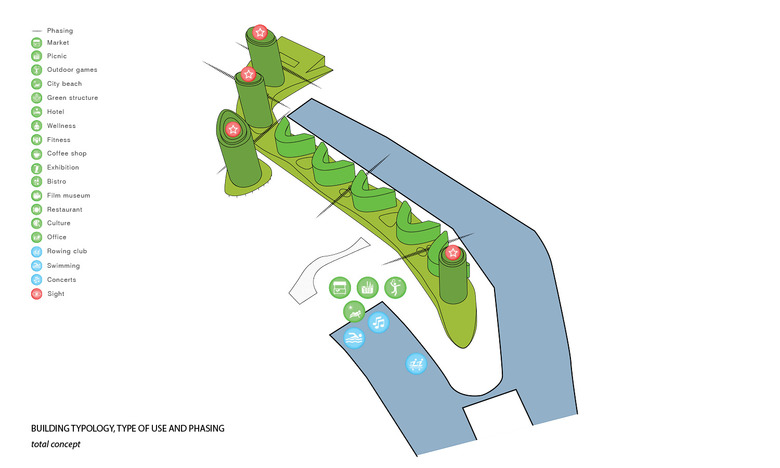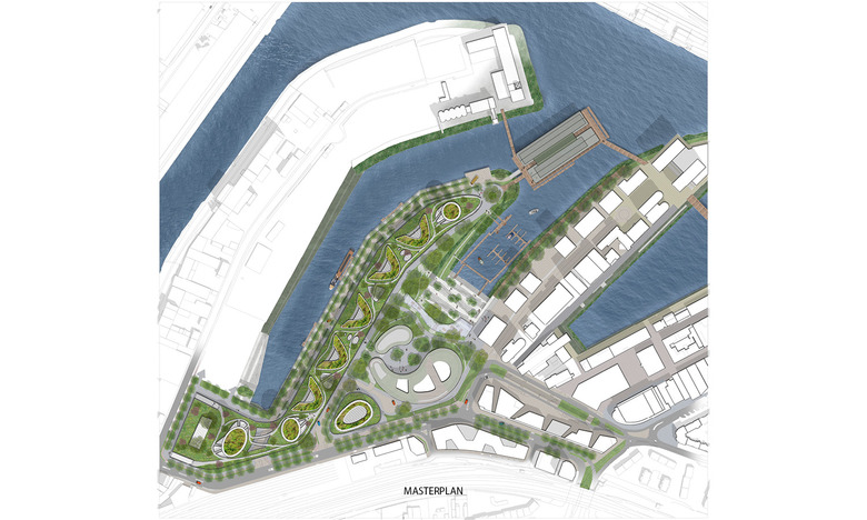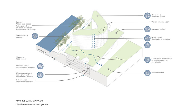 The competition entry for Düsseldorf harbor peninsula is a sustainable urban concept for a regenerative, adaptive and resilient city. The design is based on a blue-green infrastructure which enhances the urban quality, the social life of the city and the biodiversity in the city.