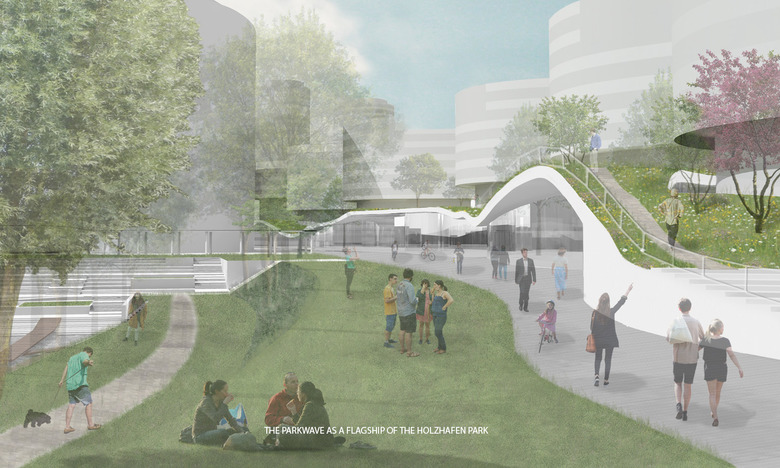 Like a green, floating canopy the Park Wave connects both in horizontal and vertical direction all ways, functions and uses, as well as public and semi-public spaces. With an inviting stairway in the north, which can be used for outdoor activities, the Park Wave links the north of the peninsula with the south of the harbour basin B and allows the continuation of the Park in the future there. Building volumes are punched through the Park wave. Large openings in the roof mark the way connections in east-west direction and let light penetrate down to the level of mobility, where shared services and E charging stations are located. Along these daylight flooded passages the entrances to the different uses can be found. Light, transparent façades enclose the spaces under the green, waved roof. The result is a highly attractive, dynamic place that invites you to meet, to exchange, to work together and to remain. The Park Wave is the flagship of the Holzhafen Park, the lively engine that combines and links in spatial, functional and social ways during the day and also in the evening hours. People work here in modern, open offices, and co-working spaces, meet at noon in bistros and cafés, as well as in the evening in restaurants. Also people can use the roof garden for a run or visited a wellness or fitness studio on the ground level. But also music and exhibition lovers can find here attractive offers.