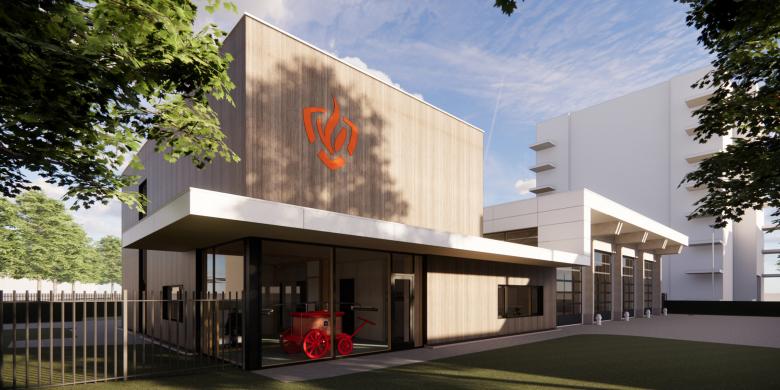 The differently high building parts are connected by a folded roof, which also accentuates the transparent corner of the building, where an old handcart of the fire brigade is exhibited