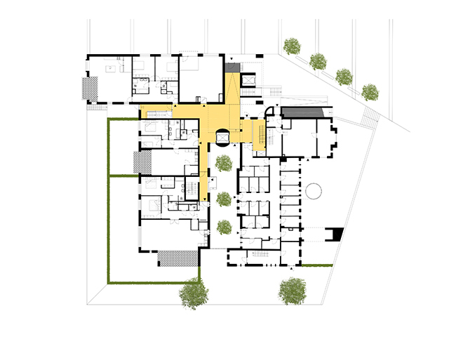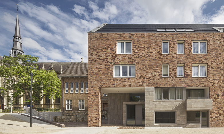 Maison Proosdij consists of three building volumes, which are connected to one another via a central hall. The entrance to the complex is located on the side of the enlarged market square, where also the public access to the underground parking is located at a prominent porch. The contours of the new building elements are oriented with respect to shape, profile and volume of the monastery, but speak in terms of architecture and materiality of each block a distinctive, own language. In the existing, partially demolished monastry two multi-storey townhouses are realized, one of which in the former chapel. The facades of the monastery are restored and only where necessary, adapted to the requirements of the new use. In the new wing 19 apartments are implemented on four levels, which are either geared to the park or to the market square. The entire complex keeps the memory of the old, in the cityscape of Meerssen charakteristik monastery alive, but at the same time due to the additions the ensemble creates a new significant character for the place between the monumental basilica and the beautiful park with historic trees. The expanded marketplace, framed by the construction of the Maison de Ville and the Maison Prosdij will make an important contribution to the new perception of the public space in the heart of Meerssen.