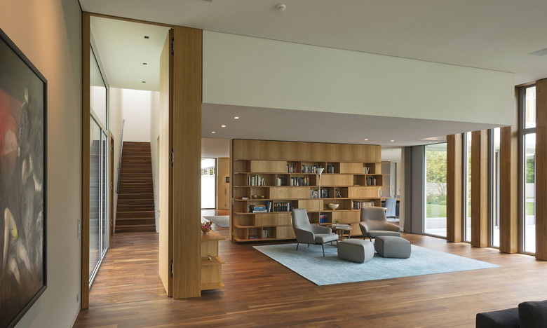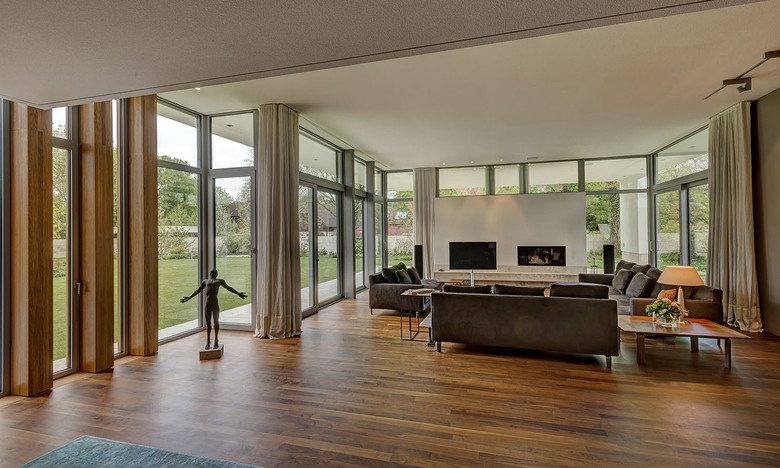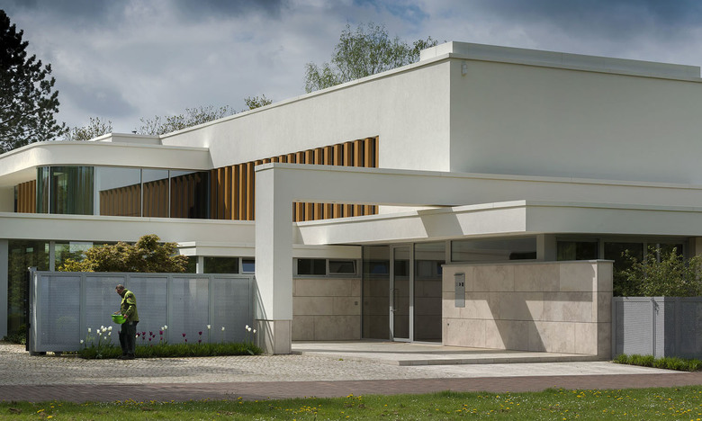 The limitation of using just a few materials such as oak and walnut, Bauhaus travertine and white plaster, which both can be used outside and inside and with the exception of plaster, for walls and floors, accomplish the villa and garden to be unified into a harmonious ensemble.