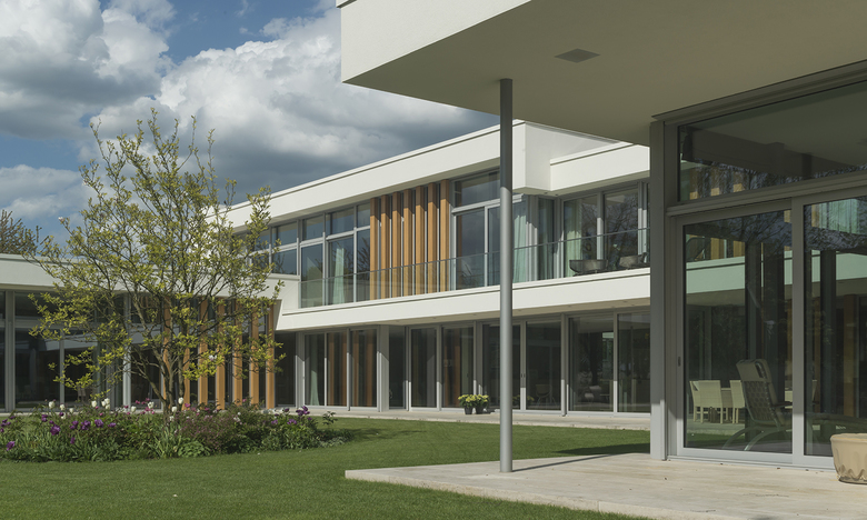 Elongated walls, covered with Bauhaus Travertine and plaster together with cantilevered roofs and vertical oak lamellas define the elegant appearance.