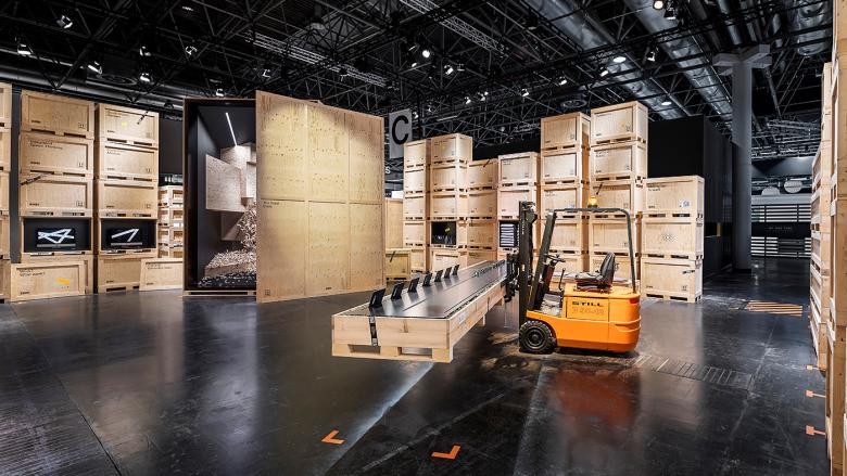 Das Projekt macht zunächst einen ungewohnten Eindruck. Zwischen all den konventionell gestalteten Messeständen ragt eine riesige Kistenburg hervor. Die Kisten sind Crates. Der gemeinsame Nenner im Messebau, der heimliche Held jeder Ausstellung – und für den Besucher doch unsichtbar, weil sie zur Eröffnung stets von der Bildfläche verschwunden sind.