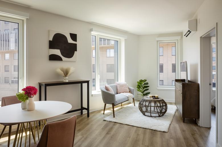 Vital Brookdale provides amenities that promote wellness and create safe spaces for its residents and the larger community. Tenants have access to a terrace, landscaped courtyards, a dog run, play area, and passive recreation and seating areas. Additional amenities include a community room, game room, library/co-working space, fitness room, laundry room, and a bike storage room. The design of Vital Brookdale provides visual and physical connections between active and passive outdoor spaces, the interior common areas, and many of the units.