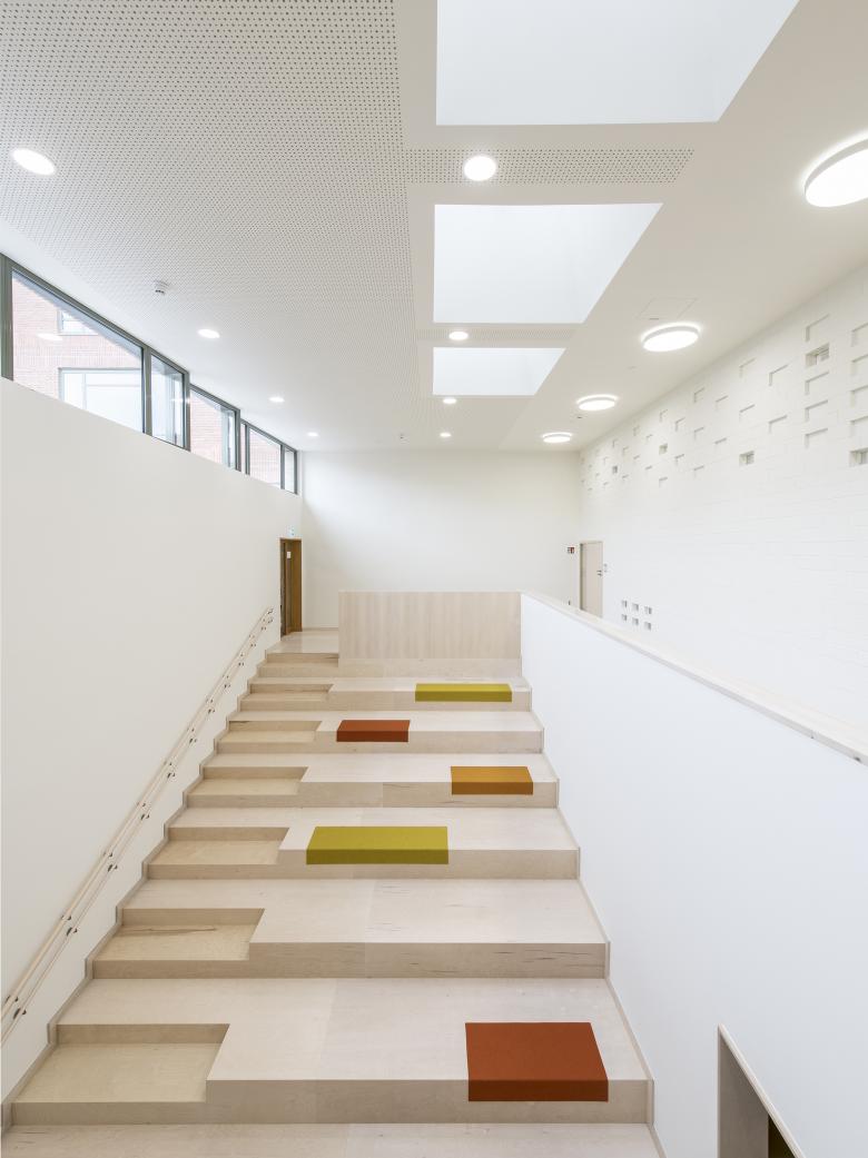 Die größte Transformation erfuhr das Hörsaalgebäude: Aus den nicht mehr nutzbaren Hörsälen wurden eine zeitgemäße Mensa mit Küche sowie eine Kindertagesstätte. Die ursprünglichen Raumhöhen bleiben spürbar und vermitteln den Charakter des Bestands. Damit wird das Bayernkolleg Augsburg zu einem Vorzeigeprojekt für nachhaltigen Bildungsbau, in dem Umbau, Denkmalpflege und Zukunft des Lernens zusammenfinden.