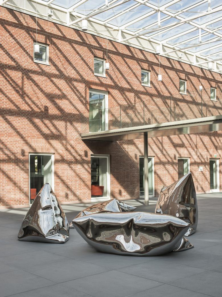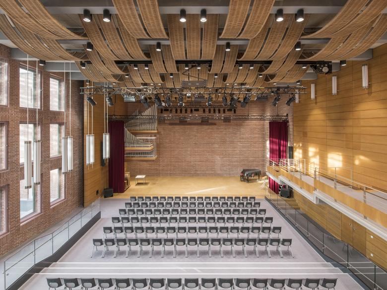 Das Atriumgebäude bildet das Herzstück: Verwaltung und Bibliothek im Erdgeschoss, ein großer Konzertsaal als multifunktionaler Raum und im Obergeschoss ein moderner Lehrerbereich. Das überdeckte Atrium mit Stahl-Glas-Dach verbindet Geschichte und Gegenwart. Das Seminargebäude beherbergt Unterrichtsräume in allen Geschossen und bewahrt die großzügige Pausenhalle.