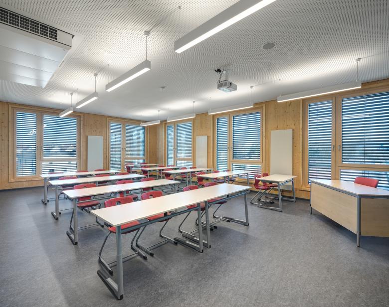 Während das Erdgeschoss wie auch die Teilunterkellerung in Massivbauweise aus Stahlbeton ausgeführt werden, wird der Klassentrakt im Obergeschoss in Holzbauweise errichtet. Der Einsatz von Holz verleiht dem Marktplatz eine warme, behagliche Atmosphäre, die überspannende Sheddachkonstruktion mit Oberlichtern schafft eine natürliche Helligkeit. Die ebenso offene und lichtdurchflutete Gestaltung der Mensa und der Klassenräume verleiht dem gesamten Erweiterungsbau eine hohe Aufenthaltsqualität.