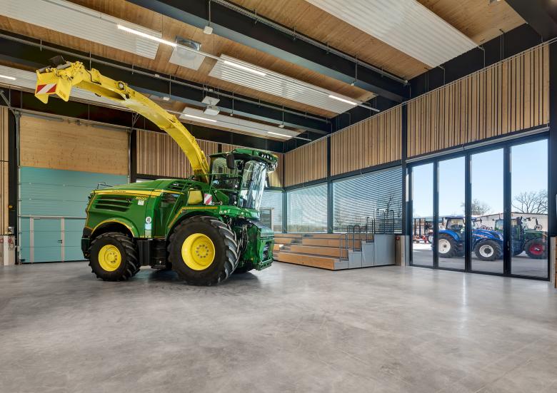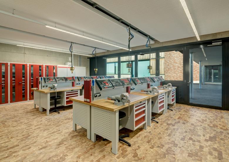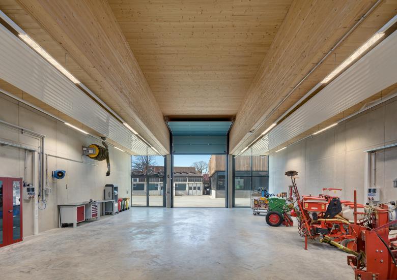 Der erste Bauabschnitt ist erfolgreich umgesetzt. Das Forum, mit Garderobe und Catering, wird über ein großzügiges Foyer erschlossen. Eine geschwungene freie Treppe führt in das Obergeschoss mit den Seminarräumen. Der Lehrhallenriegel Ost gliedert sich in das Kopfgebäude, mit Schweißerei und Lehrwerkstätten für die Landtechnik, und den Lehrhallenbereich mit Seminarräumen.