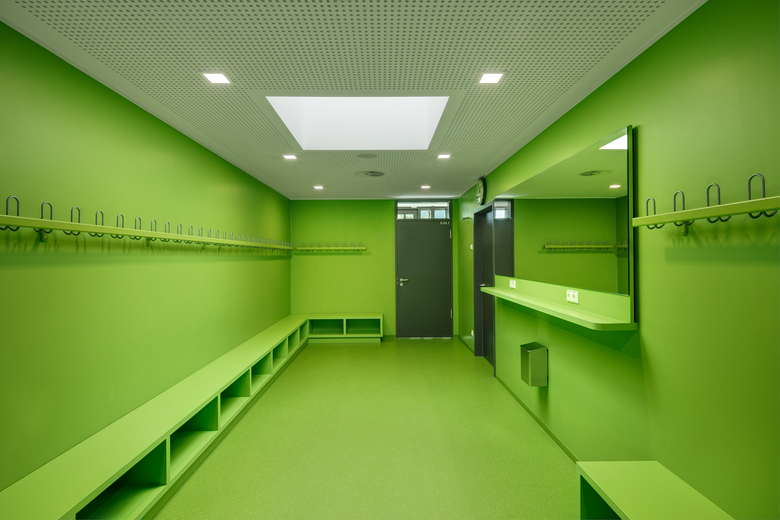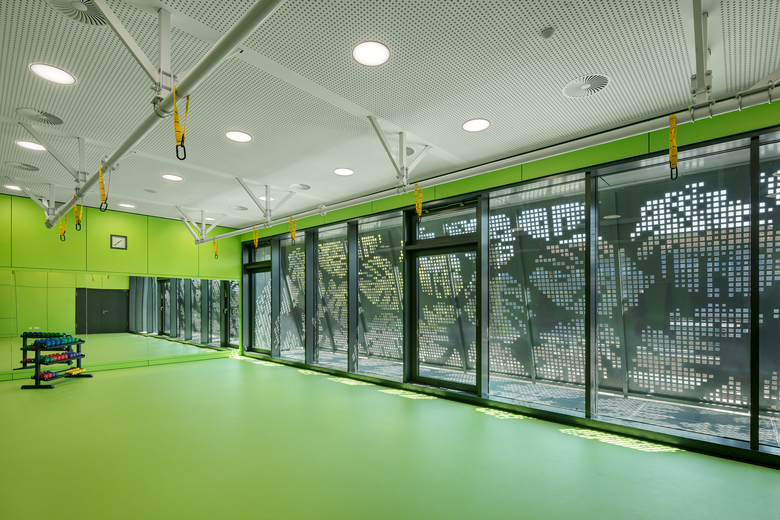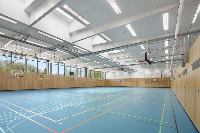 Die Sporthalle ist ein Holzskelettbau. Satteldachbinder aus Leimholz überspannen in Querrichtung die komplette Halle. Sie sind 32 Meter lang, bis zu 2,75 Meter hoch und wurden in einem Stück auf die Baustelle geliefert und eingebaut. Die Wände sind als gedämmte Holzständerkonstruktion mit hinterlüfteten Fassadenkonstruktionen ausgeführt. Die Fassade im Obergeschoss ist mit großformatigen und leichten Alumimiumsandwichpaneelen mit nicht sichtbarer Agraffenbefestigung bekleidet, beides aus Aluminium, sie können daher vollständig recycelt werden und dem Kreislauf der Wiederverwertung zugeführt werden. Die Fassade im Erdgeschoss mit Glasfaserbeton hat eine hohe Widerstandsfähigkeit und ist mit Grafittyschutz beschichtet. Beide Verkleidungen sind wartungsfrei. Unter dem Aspekt der Wirtschaftlichkeit und Nachhaltigkeit wurde für die Tragkonstruktion Holz als nachwachsender Rohstoff mit geringem Gewicht gewählt.