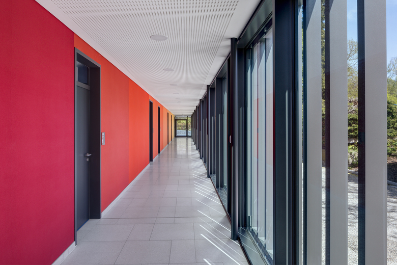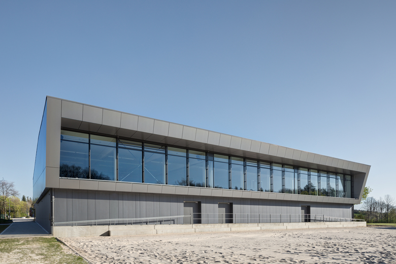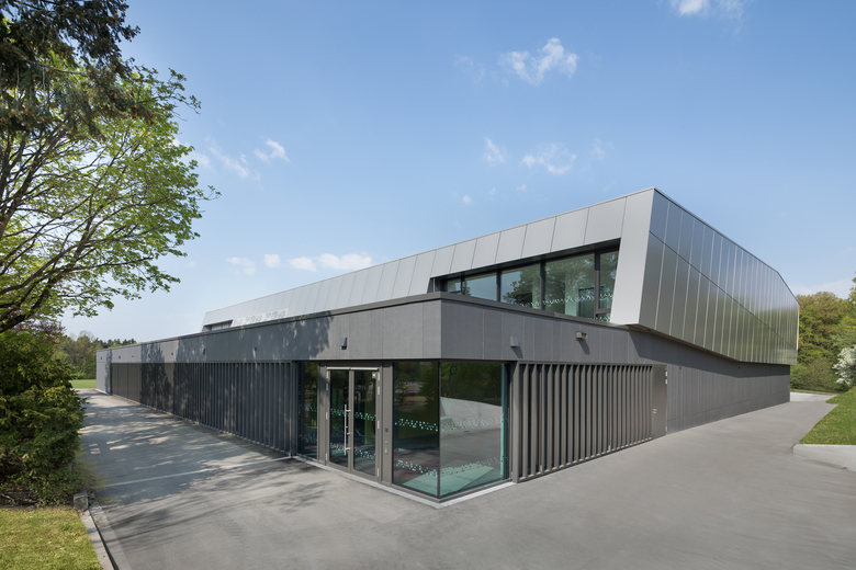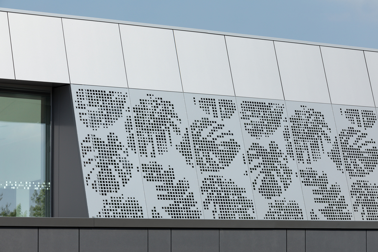 Die Entwurfsidee der Dömges Architekten AG mit einem dynamisch geformten und leichtem Baukörper, der auf einem geradlinigen schwarzen Sockel ruht, wurde mit Farbgebung und Materialität konsequent fortgeführt. Die silberne Metallverkleidung hebt sich deutlich vom dunklen Glasfaserbeton im Erdgeschoss ab und betont die freie Form der an zwei Seiten geneigten und geknickten Fassade. Mit ihrem Fugenbild folgen die großformatigen Aluminiumpaneele der Neigung des Baukörpers und unterstreichen so dessen Gesamteindruck als gebaute Dynamik für einen Ort der Bewegung.