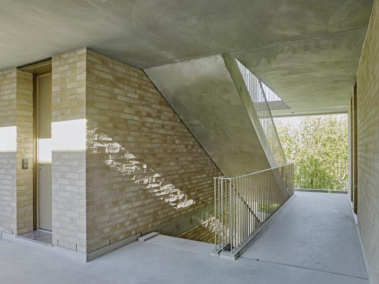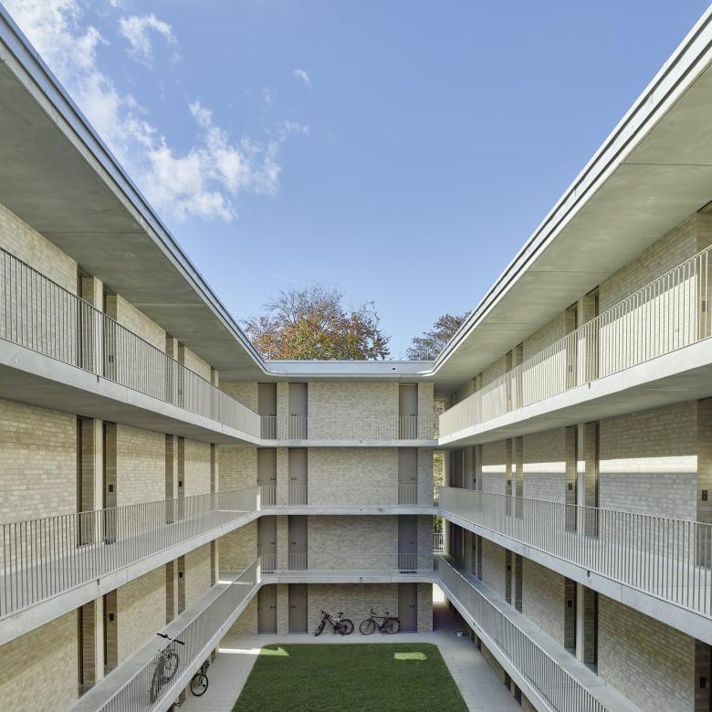 Die Erschließung des Gebäudes erfolgt barrierefrei über die Straße Auf der Schanz. Im Erdgeschoss befindet sich das barrierefreie Zimmer, erste Einheiten der Studentenappartements, der Gemeinschaftsraum für die Bewohner, sowie ein großzügiger Ankommensbereich. Die geschickte Anordnung der vier Bausteine entlang der Außenseiten des Gebäudes ermöglicht das Aufbrechen des Volumens. Über zwei vertikale Erschließungen gelangt man in die darüber liegenden Geschosse. Über den Innenhof ist für die Bewohner stets die Möglichkeit zur Kommunikation und zum Verweilen gegeben. Die Appartements sind klar und einheitlich strukturiert. Sie verfügen über zwei Zonen, dem Eingangsbereich mit Küchenzeile und Nasszelle sowie dem Wohnraum.