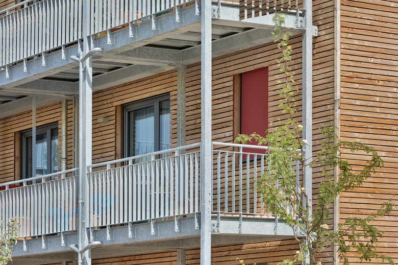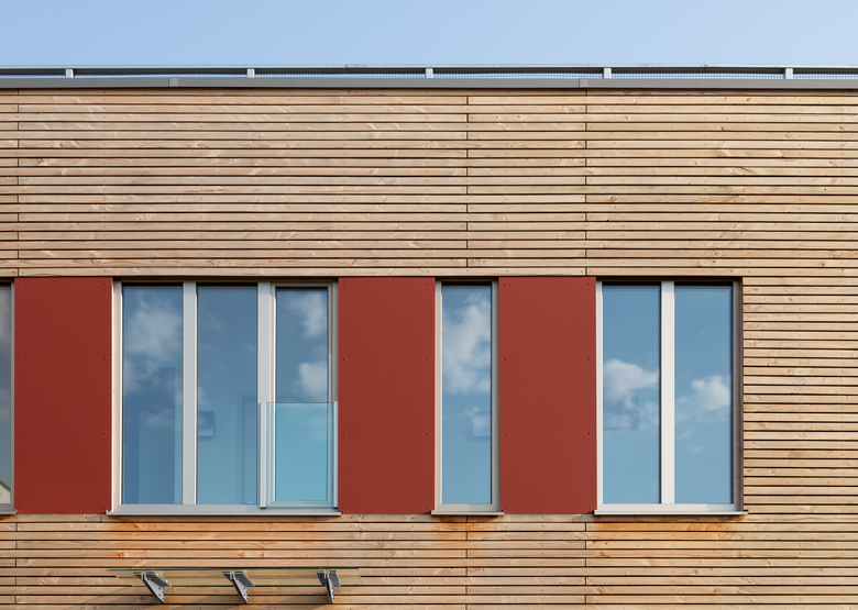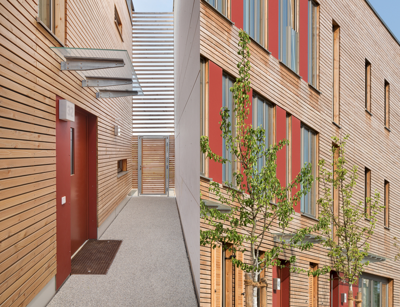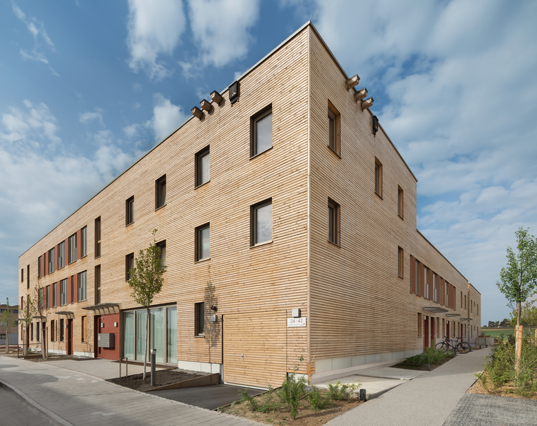 Die selbstragenden Außenwände des Gebäudes sind in Holzrahmenbauweise mit Zellulosedämmung erstellt. Die horizontale Schalung aus unbehandelter heimischer Douglasie und großzügigen Fenstern prägen die Fassade. In den Räumen sowie dem Laubengang liegt Parkettboden. Diese durchgängige Materialität ist das verbindende Element und betont die Idee des genossenschaftlichen Wohnungsbaus. Rote Faserzementplatten und Eingangselemente setzen farbliche Akzente. Das flachgeneigte Dach des mittleren Riegels ist begrünt und dient als Erholungsfläche. Auf den anderen beiden Dächern sichern Photovoltaik- und Solarthermie-Elemente in Kombination mit dem Blockheizkraftwerk den Strom- bzw. Wärmebedarf.