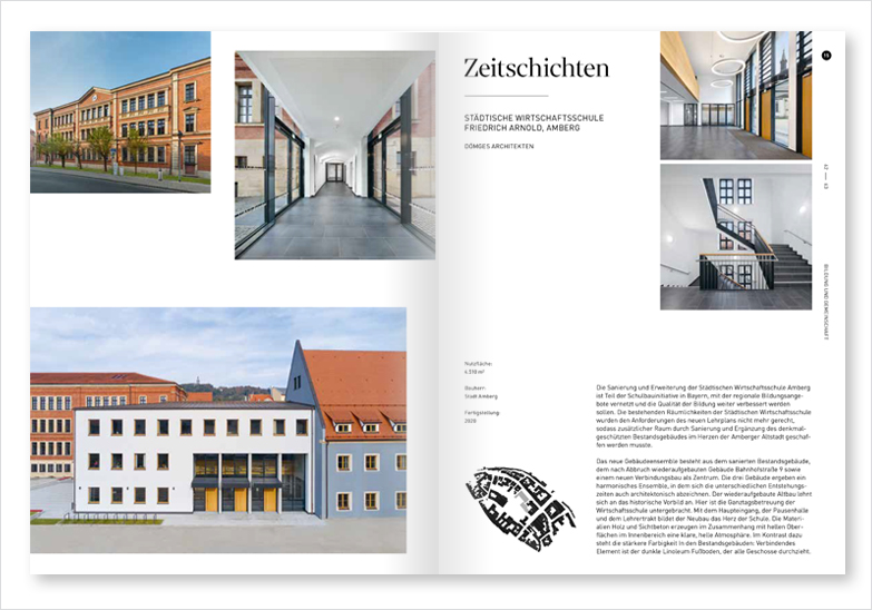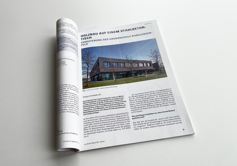 Im aktuellen Fachmagazin Schulen – Neubau, Umbau, Sanierung des Ernst & Sohn Verlags wird unser mit den Architektouren der Bayerischen Architektenkammer ausgezeichnetes Schulgebäude in Burglengenfeld vorgestellt. Dieser Erweiterungsbau bietet neue, moderne Räumlichkeiten für den Ganztagsbetrieb und ist vollständig in Holzbauweise mit einem Scheddach und Oberlichtern umgesetzt.