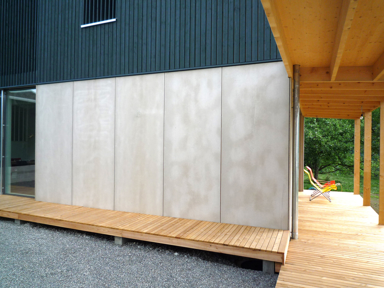 Die Unterkellerung und eine abgetreppte Bodenplatte in Beton bilden den Sockel für die zweigeschossige Holzkonstruktion mit Aussenverkleidung. Eine tannengrüne Holzverkleidung aus sägerauen Fichtenbrettern mit unterschiedlich breiten Zwischenräumen umhüllt das Gebäude und die überdeckten Aussenräume. Die Bretterverschalung dient als Sicht- und Sonnenschutz, löst sich vom Hauptvolumen und bildet Räume. Das rohe Material nimmt den Dialog mit vorhandenen bäuerlichen Architekturen auf, und setzt mit einer präzisen Detaillierung einen markanten Akzent.