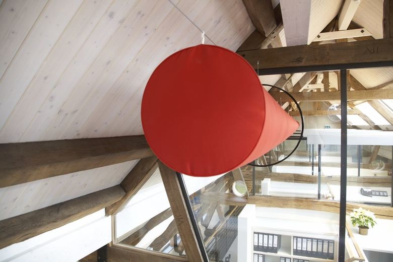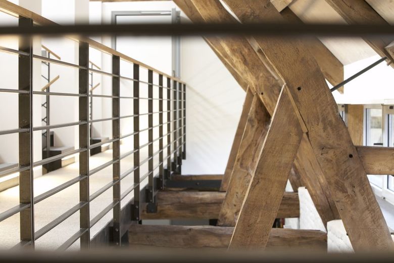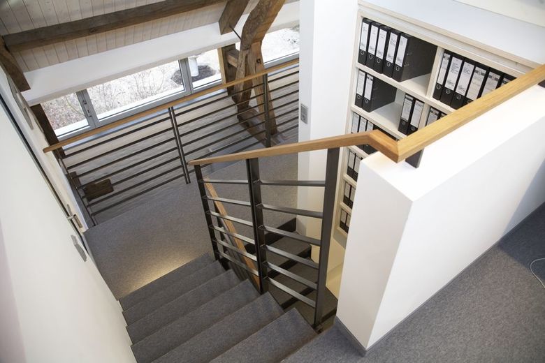 Die Bauaufgabe bestand darin den historischen Dachraum an die vorhandenen Büroflächen anzubinden. Split-Level-Ebenen wurden in die unregelmässige Dachstuhlkonstruktion aus Eiche eingefügt. - Ein Balanceakt zwischen deutlichen und klar gliedernden Strukturen des neu Hinzugefügten und des variierenden Bestands.