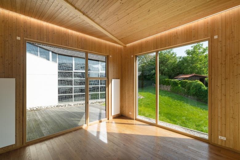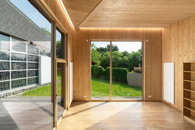 Der neue Gemeinderaum zitiert in seiner Innenraumgestaltung die Materialität des Kirchenraumes: dort wurden für Decke und Fußboden ebenfalls Holz verwendet. Die Vorfertigung von Gebäudeteilen und die damit verbundene Verkürzung der Bauzeit sprach zusätzlich für die Verwendung von Holz als Baustoff. Die Gestaltung innen und außen ist schlicht und zurückhaltend, das Holz bleibt sichtbar. Sie passt sich unaufdringlich an den Kirchenbau an. So strahlt der Raum eine warme Atmosphäre aus, die durch dezente, indirekte Beleuchtung unterstrichen wird. Große Fensterflächen lassen den Blick ins Grün der Umgebung frei. Der Zugangsbereich der Kirche ist von Sichtbetonoptik geprägt, so fügt sich nahtlos und harmonisch der Erweiterungsbau an.