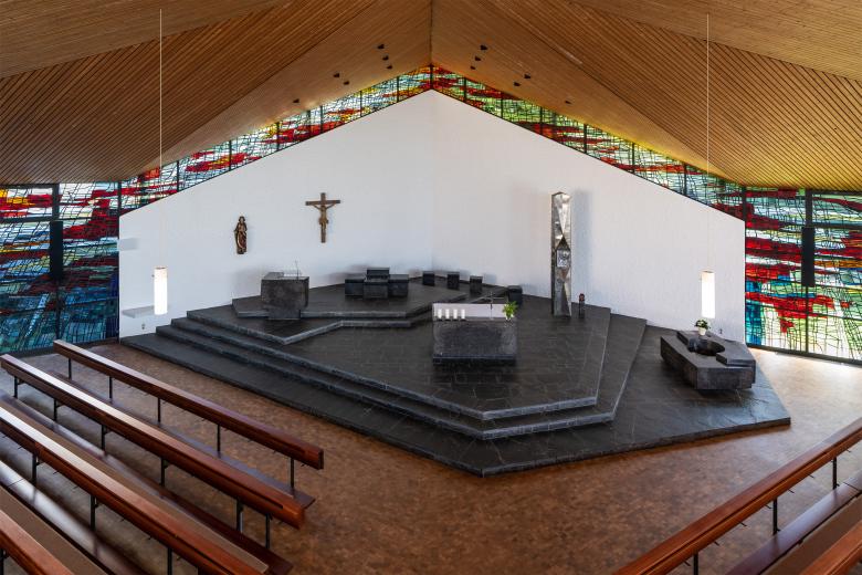 Für die Gründung wurde das Fundament des Kirchturms, der nie errichtet wurde, genutzt. Ein kleiner, aber feiner Gemeinderaum mit Küchenzeile, barrierefreiem WC und Abstellraum/Lager wurde nach Anforderung der Gemeinde geplant. Dieser Erweiterungsbau wurde in Holzbauweise realisiert und greift die Materialität der Innengestaltung der Kirche auf.