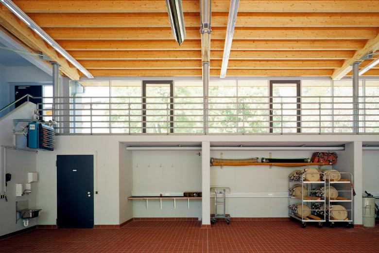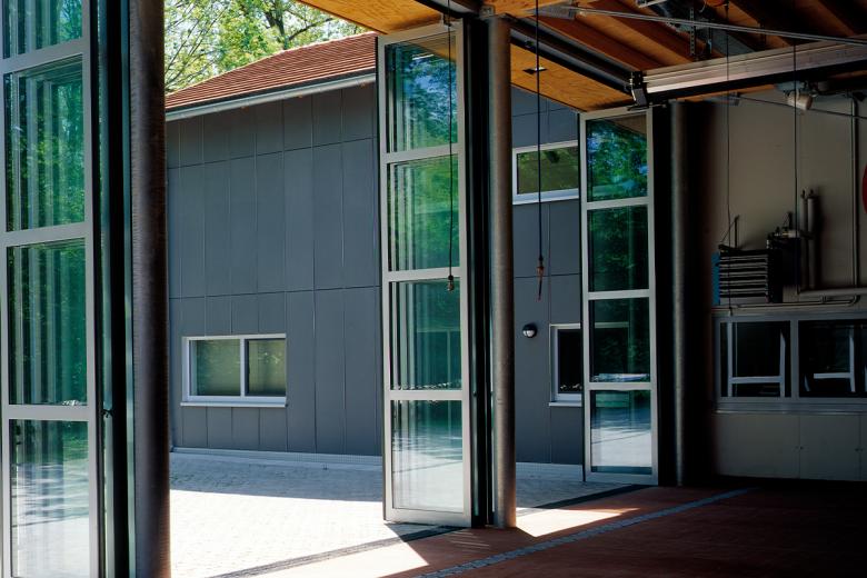 Nach Süden und Norden ist die Fahrzeughalle großzügig aufgeglast. Alle tragenden Wand- und Deckenteile wurden in Ortbeton erstellt. Die Dachkonstruktionen der beiden Bauteile bestehen aus unterspanntem Leimbinder, über der Halle als Flachdach, über dem Schulungsbereich als Steildach ausgeführt. Das äußere Erscheinungsbild wird geprägt von durchgefärbten Faserzementtafeln in Kombination mit Metall und Glas.